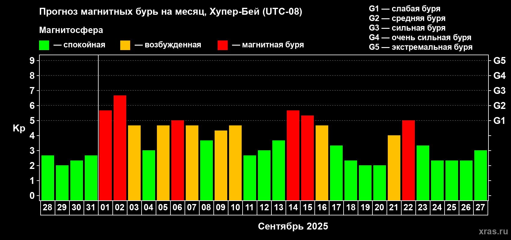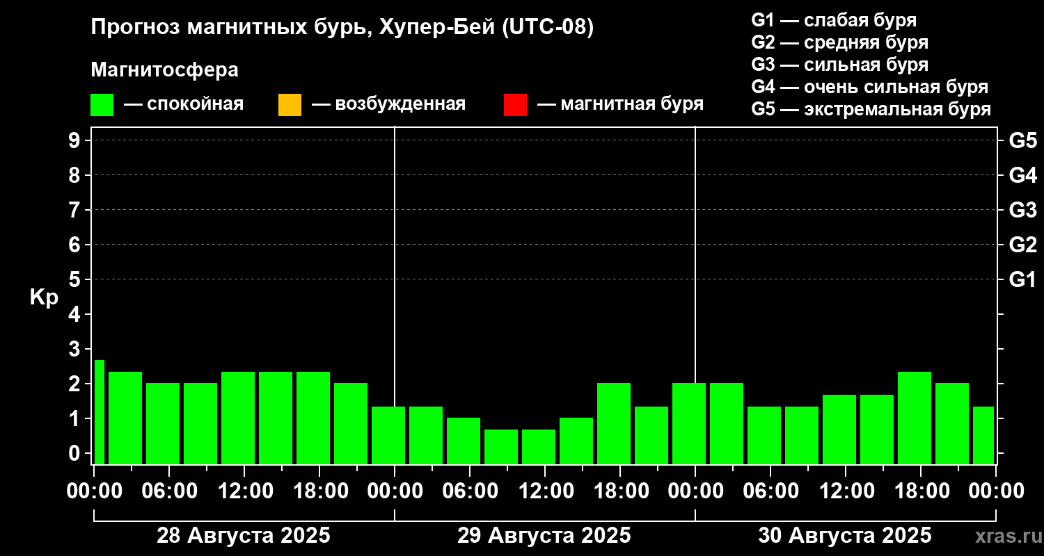 Прогноз магнитных бурь в Хупер-Бейе — 28 августа 2025 года