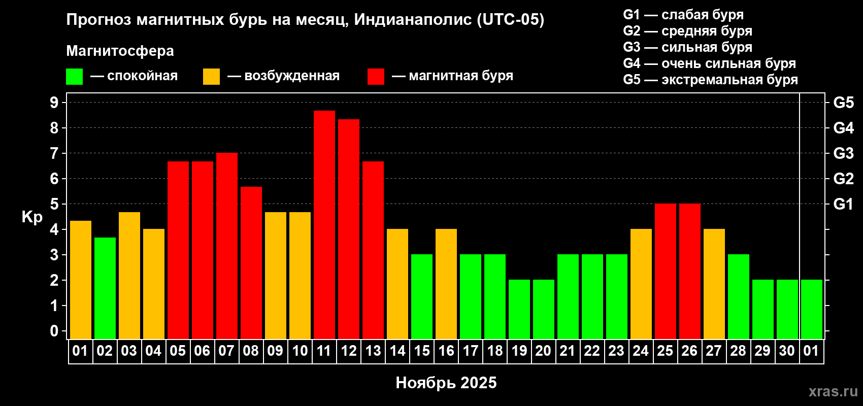 Прогноз магнитных бурь в Индианаполисе на 1 ноября 2025 года