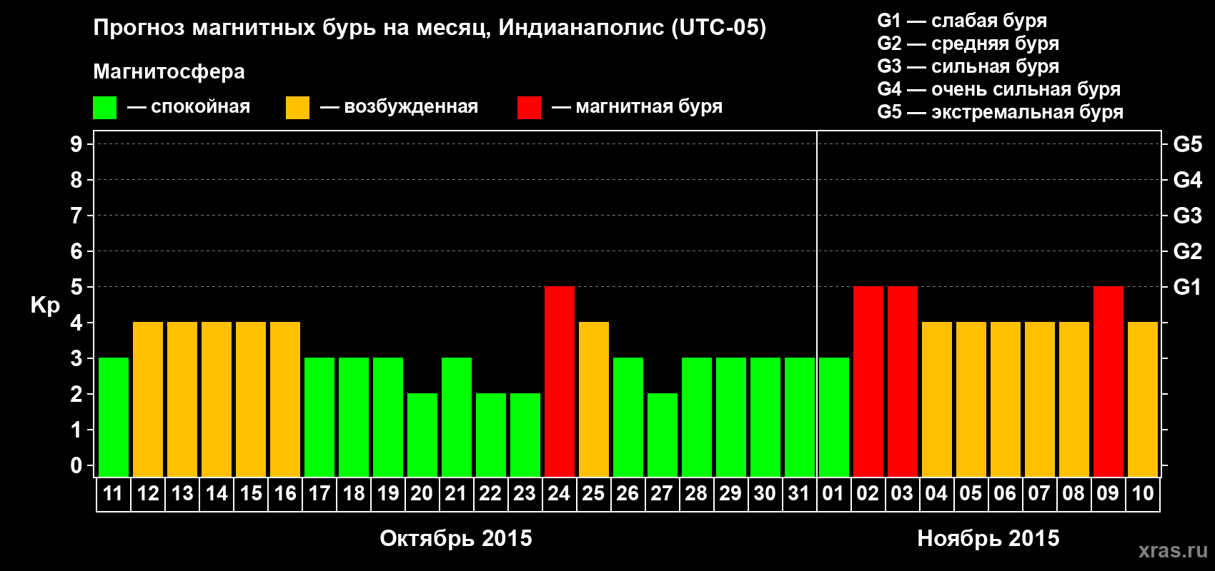 Прогноз магнитных бурь в Индианаполисе на 11 октября 2015 года
