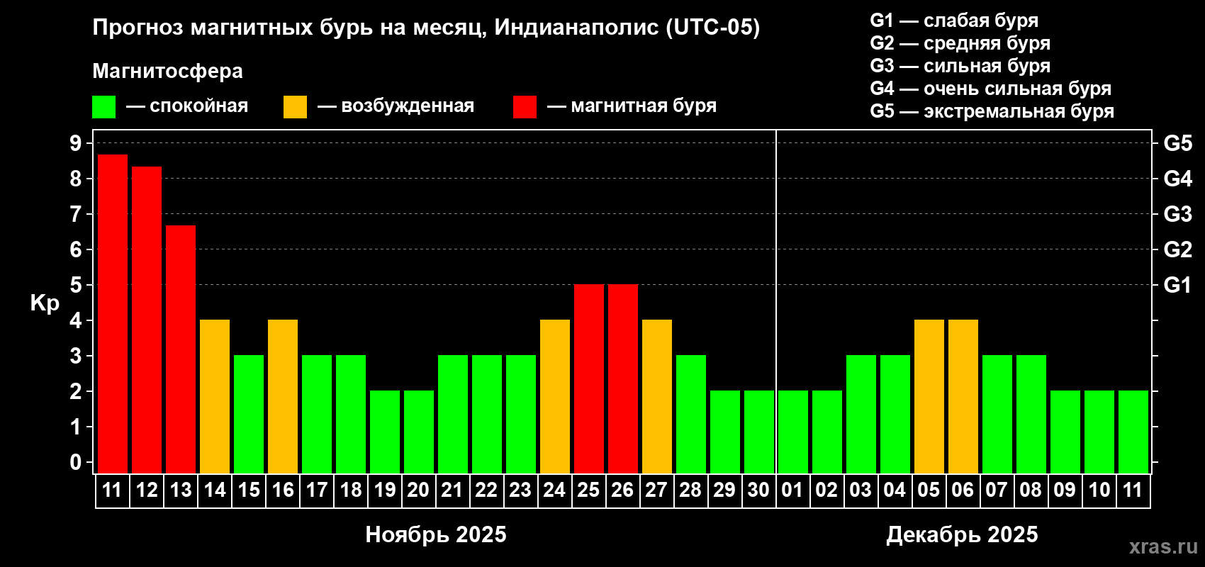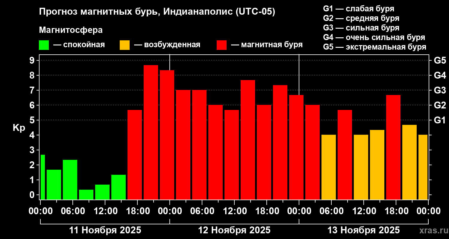 Прогноз магнитных бурь в Индианаполисе на 11 ноября 2025 года