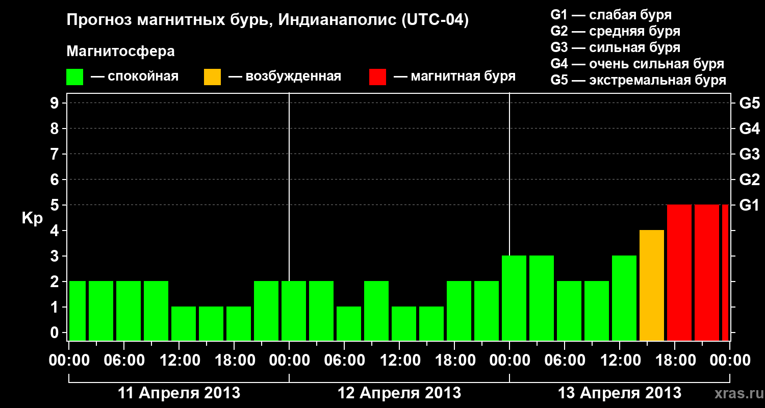 Прогноз магнитных бурь в Индианаполисе на 11 апреля 2013 года