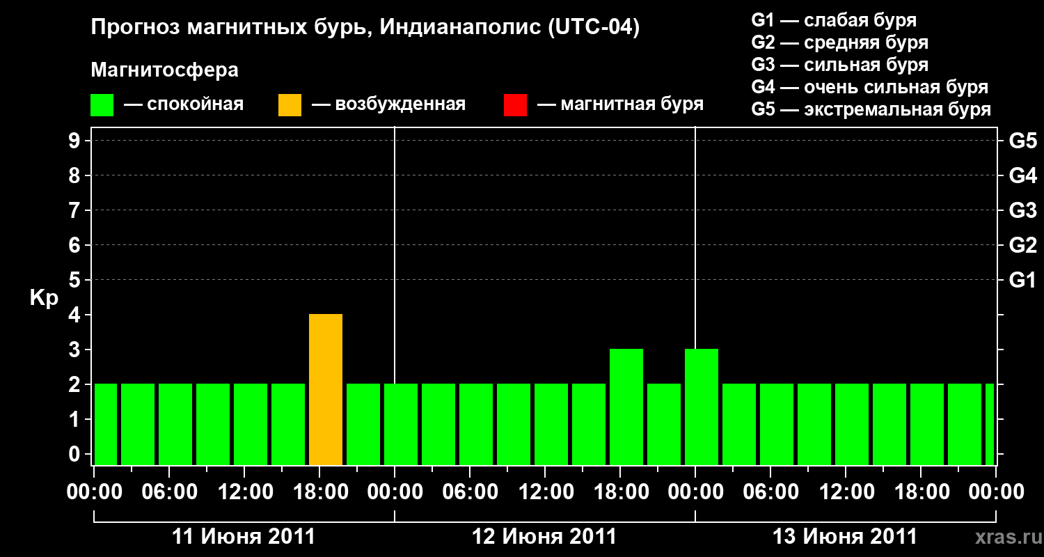 Прогноз магнитных бурь в Индианаполисе на 11 июня 2011 года