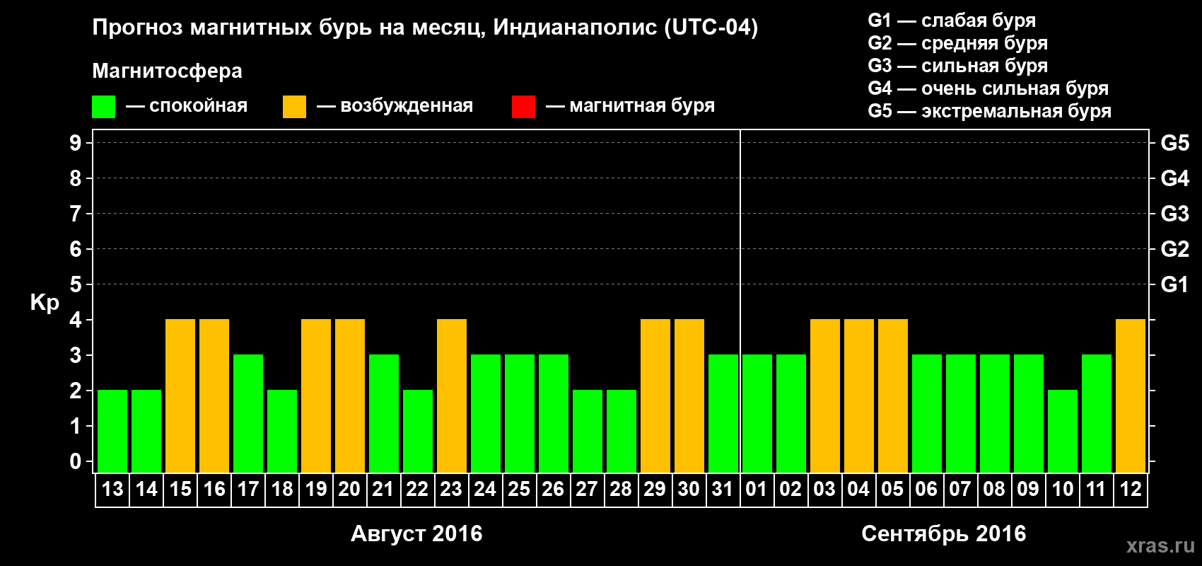 Прогноз магнитных бурь в Индианаполисе на 13 августа 2016 года