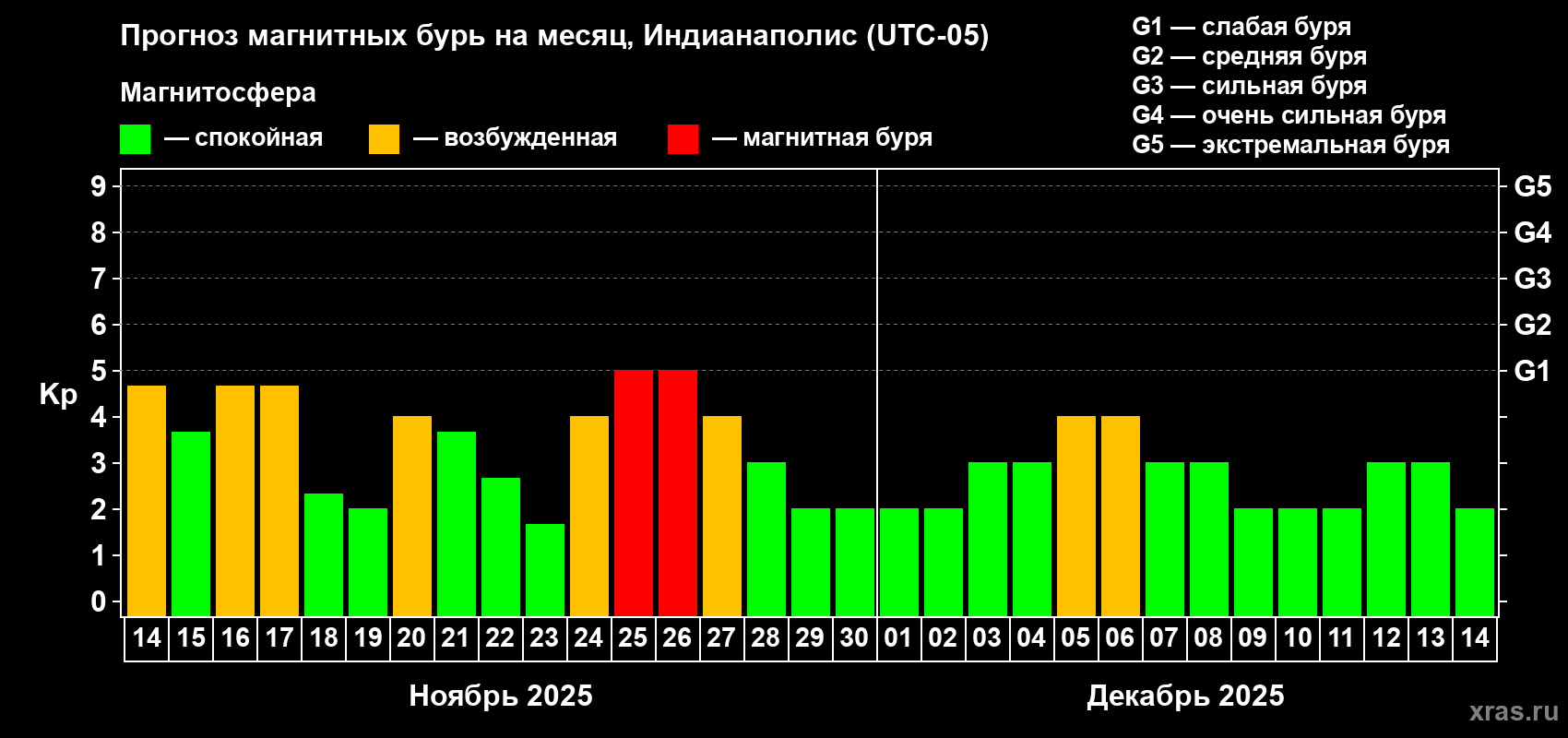 Прогноз магнитных бурь в Индианаполисе — 14 ноября 2025 года