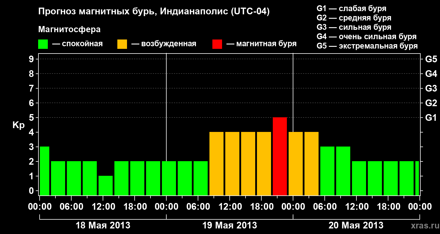 Прогноз магнитных бурь в Индианаполисе на 18 мая 2013 года