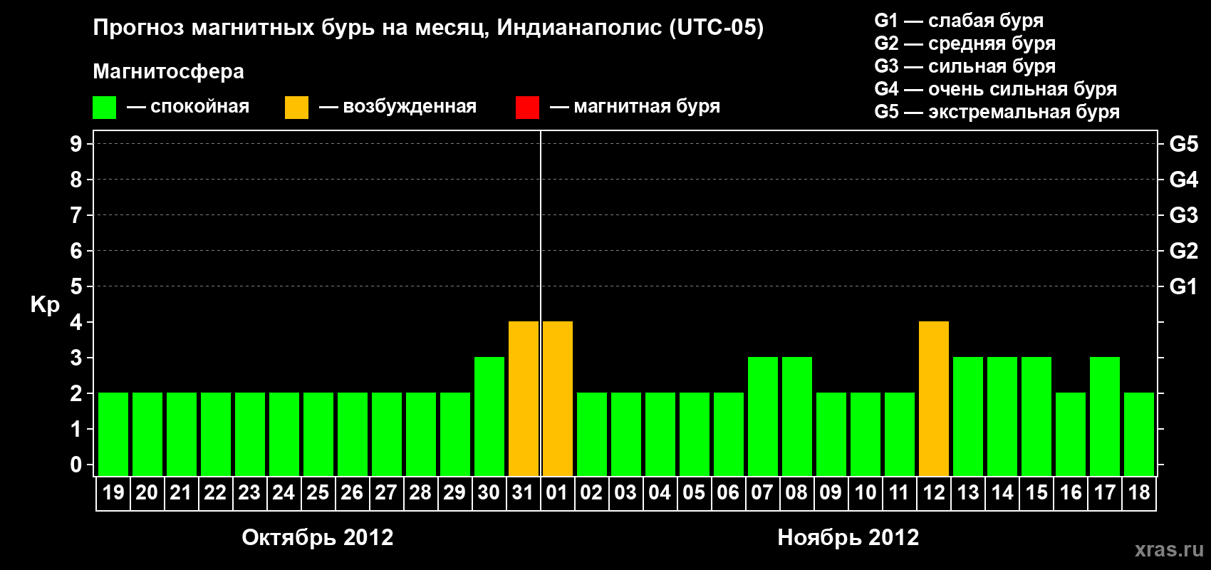 Прогноз магнитных бурь в Индианаполисе на 19 октября 2012 года