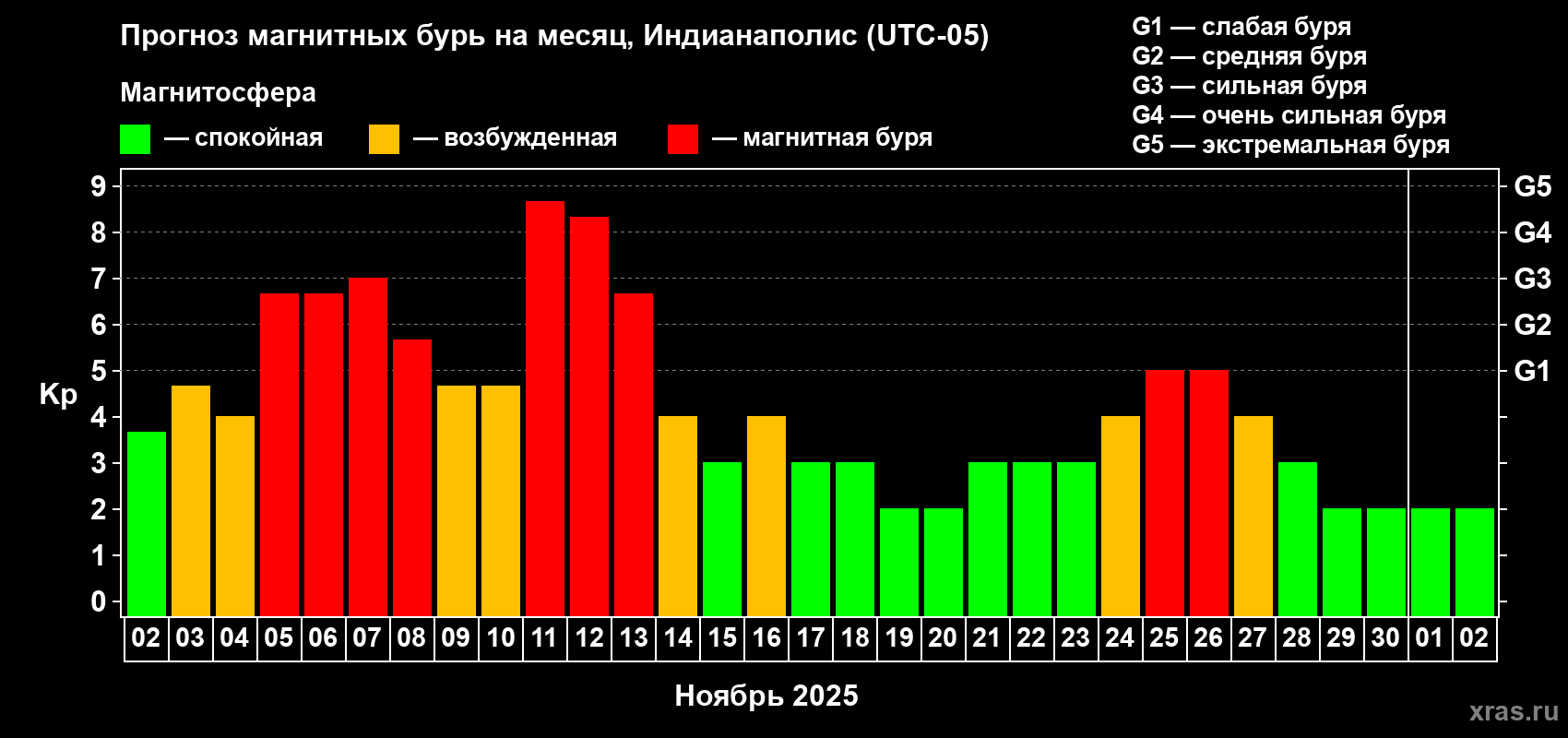 Прогноз магнитных бурь в Индианаполисе на 2 ноября 2025 года