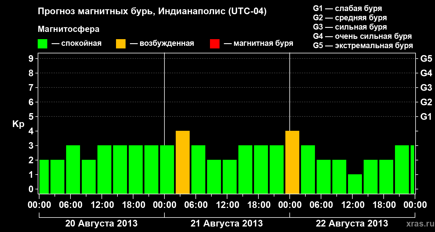 Прогноз магнитных бурь в Индианаполисе на 20 августа 2013 года