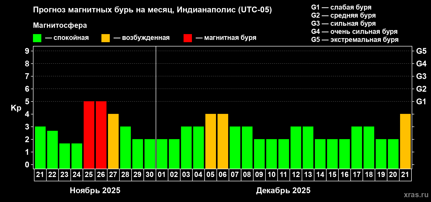 Прогноз магнитных бурь в Индианаполисе — 21 ноября 2025 года