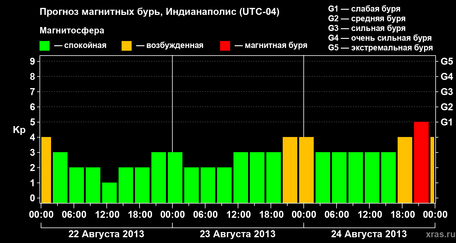 Прогноз магнитных бурь в Индианаполисе на 22 августа 2013 года