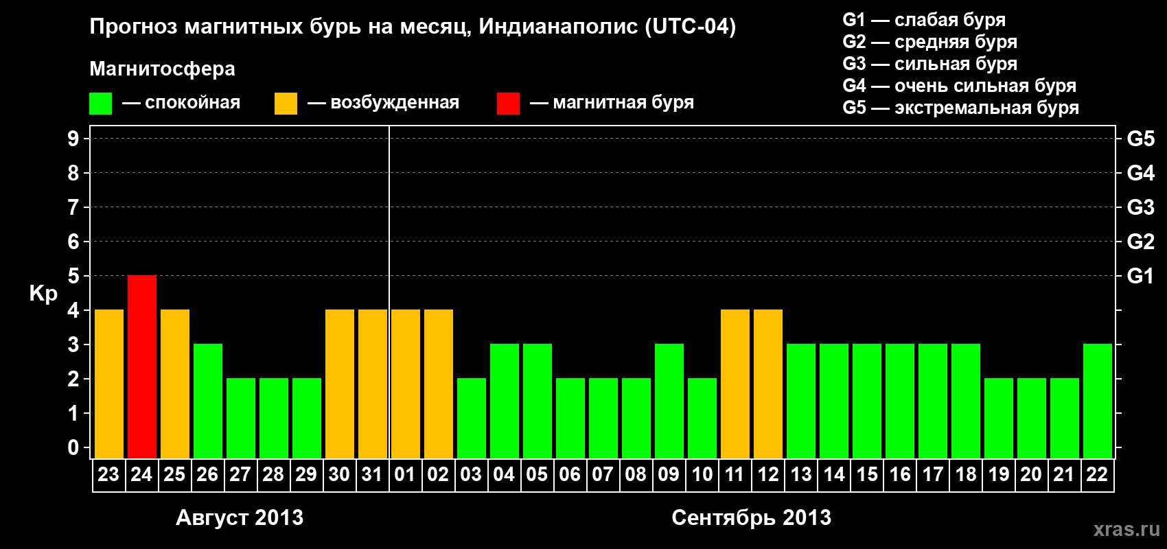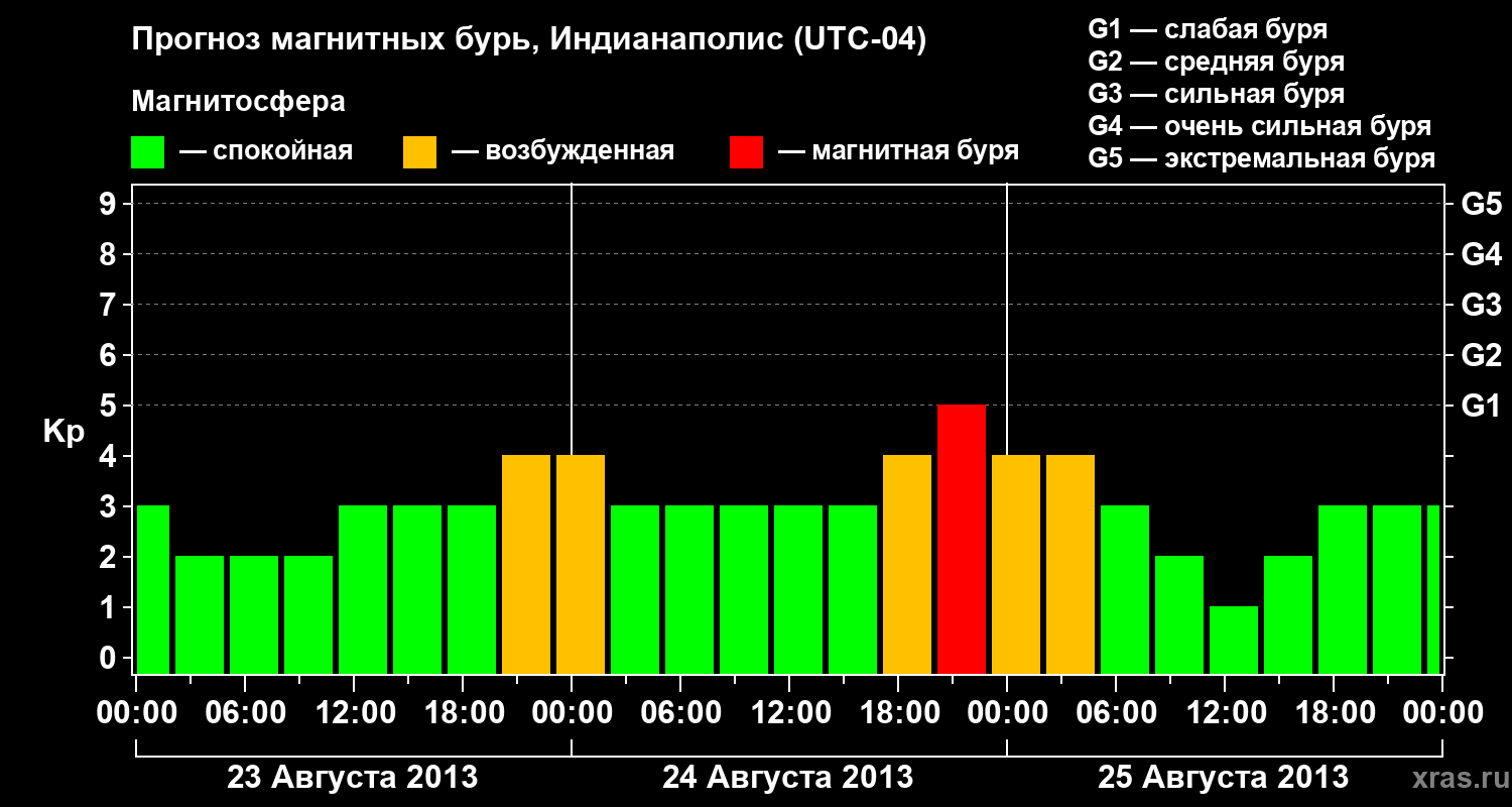 Прогноз магнитных бурь в Индианаполисе на 23 августа 2013 года