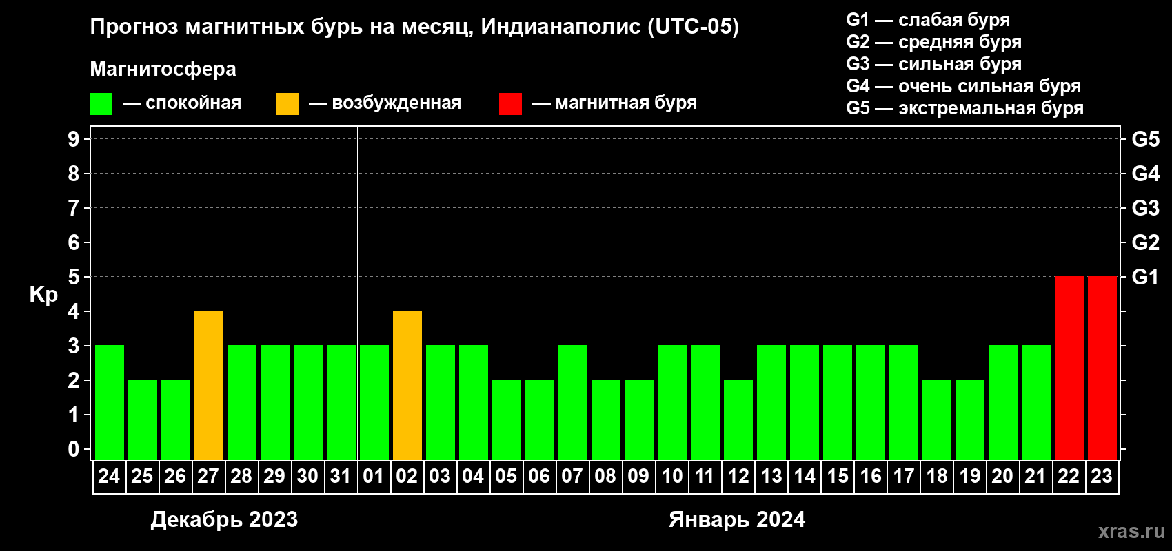 Прогноз магнитных бурь в Индианаполисе на 24 декабря 2023 года