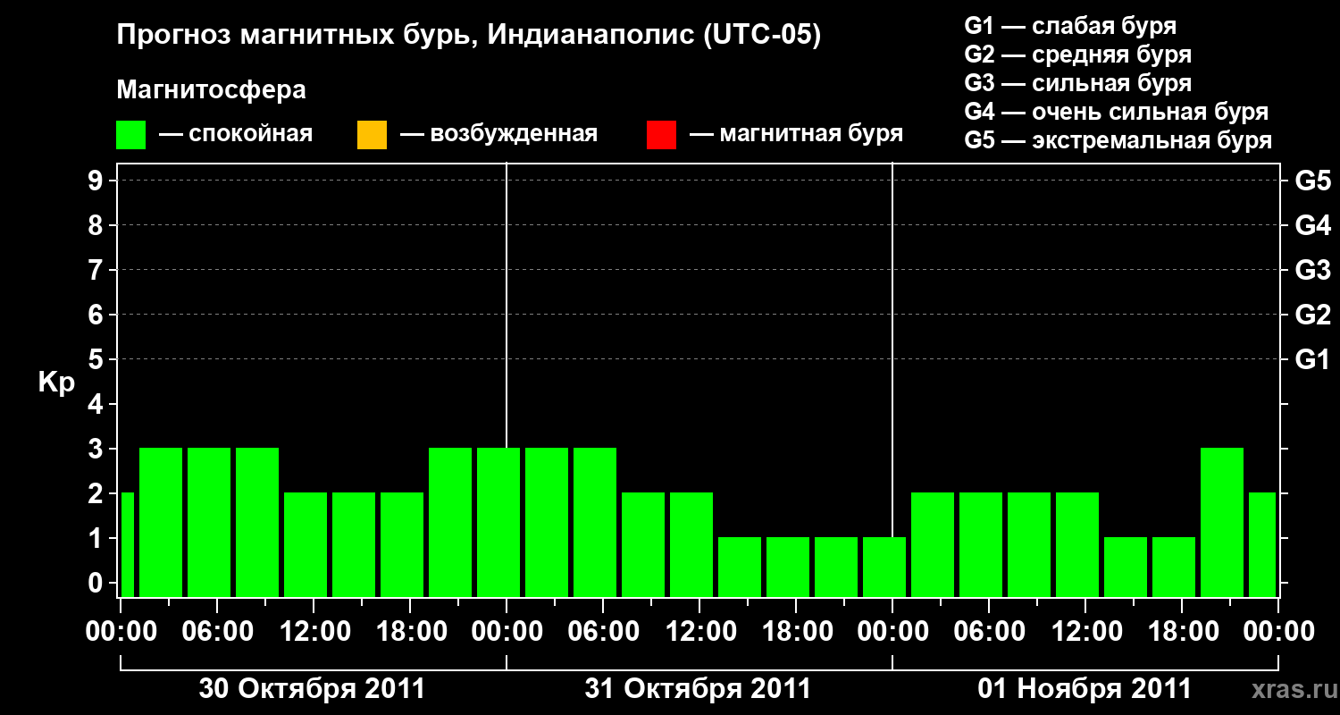 Прогноз магнитных бурь в Индианаполисе на 30 октября 2011 года