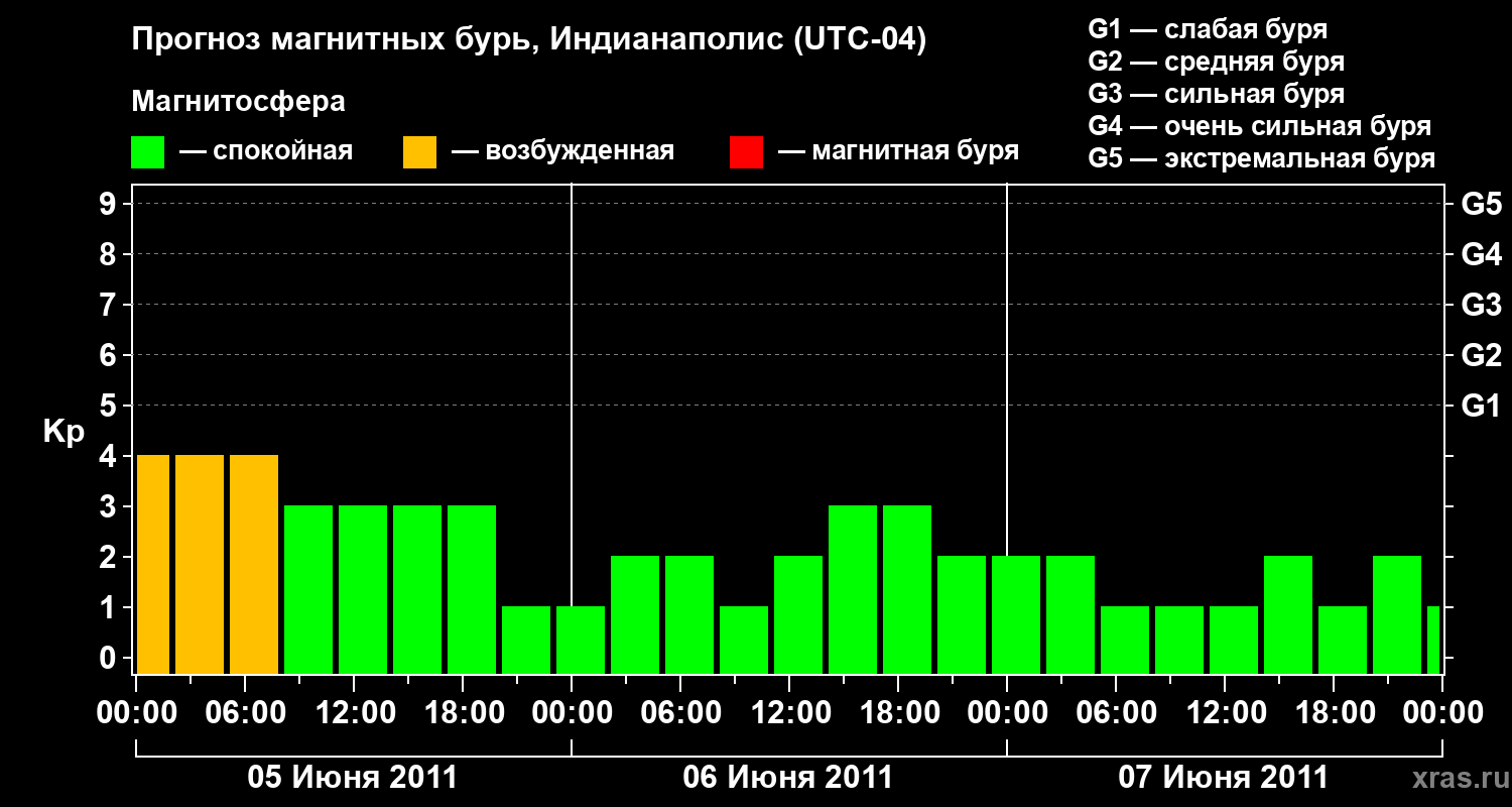 Прогноз магнитных бурь в Индианаполисе на 5 июня 2011 года