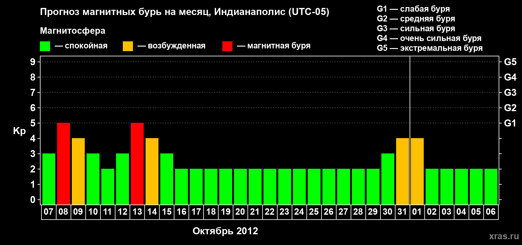 Прогноз магнитных бурь в Индианаполисе на 7 октября 2012 года