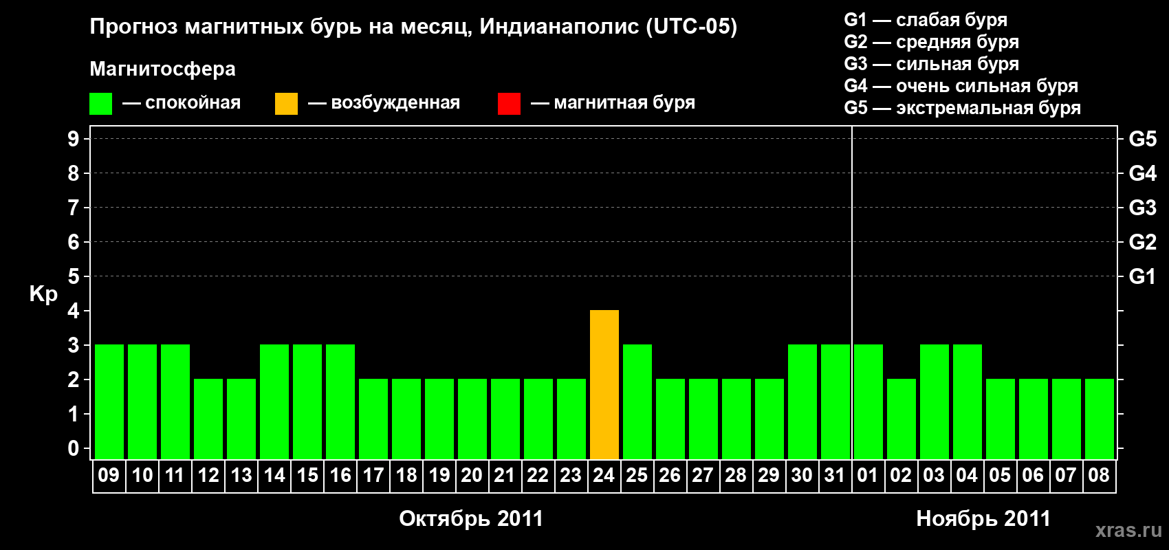 Прогноз магнитных бурь в Индианаполисе на 9 октября 2011 года