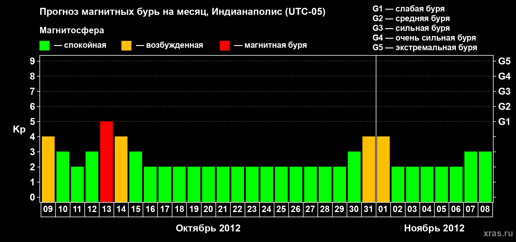 Прогноз магнитных бурь в Индианаполисе — 9 октября 2012 года