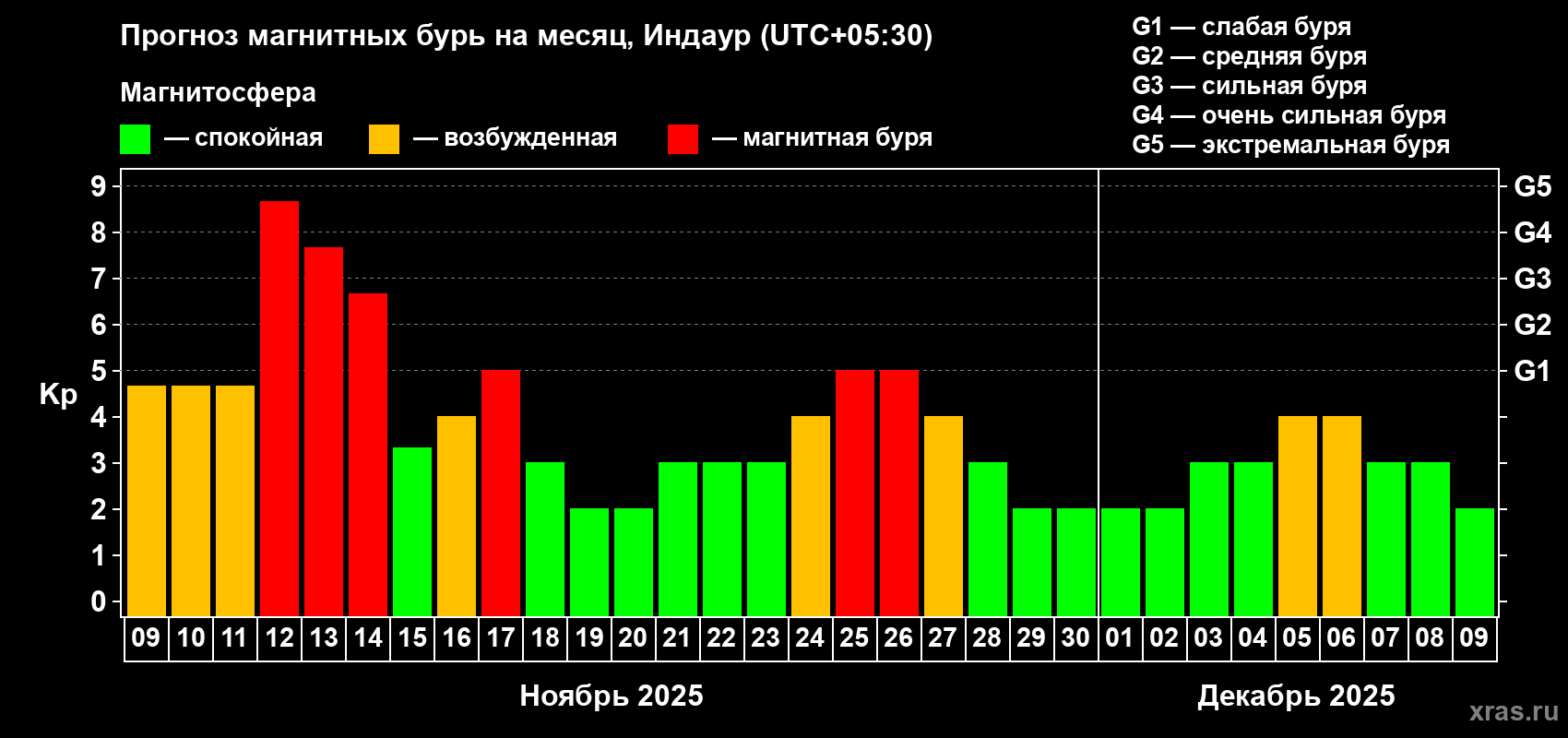 Прогноз магнитных бурь в Индауре — 9 ноября 2025 года