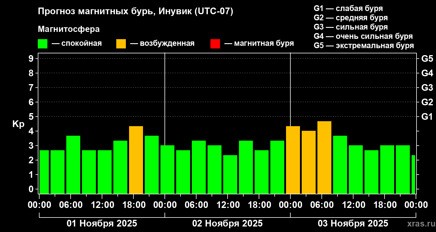Прогноз магнитных бурь в Инувике — 1 ноября 2025 года