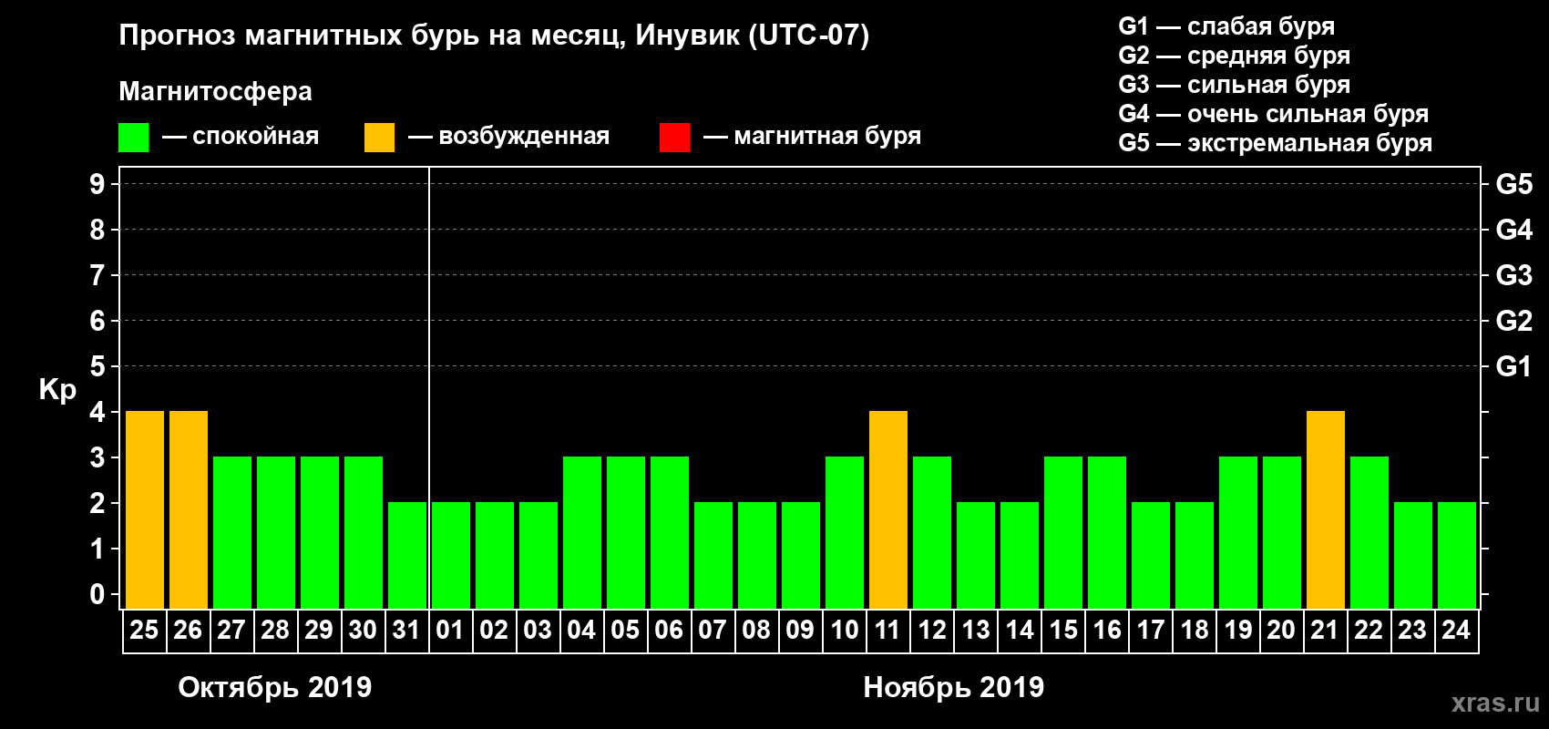 Прогноз магнитных бурь в Инувике — 25 октября 2019 года