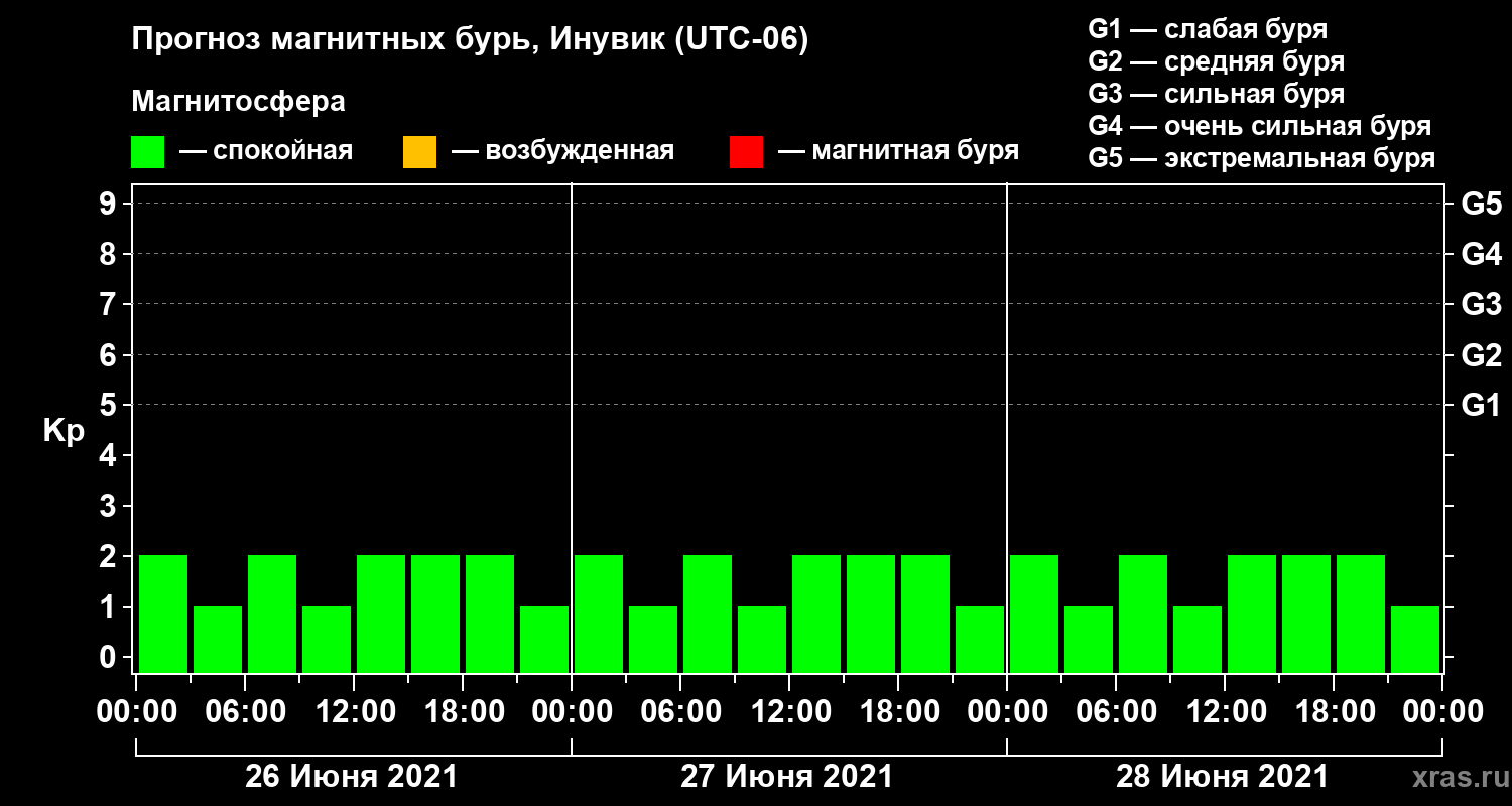 Прогноз магнитных бурь в Инувике — 26 июня 2021 года