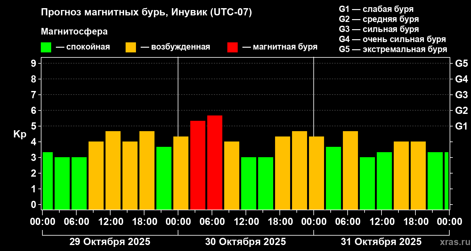 Прогноз магнитных бурь в Инувике — 29 октября 2025 года