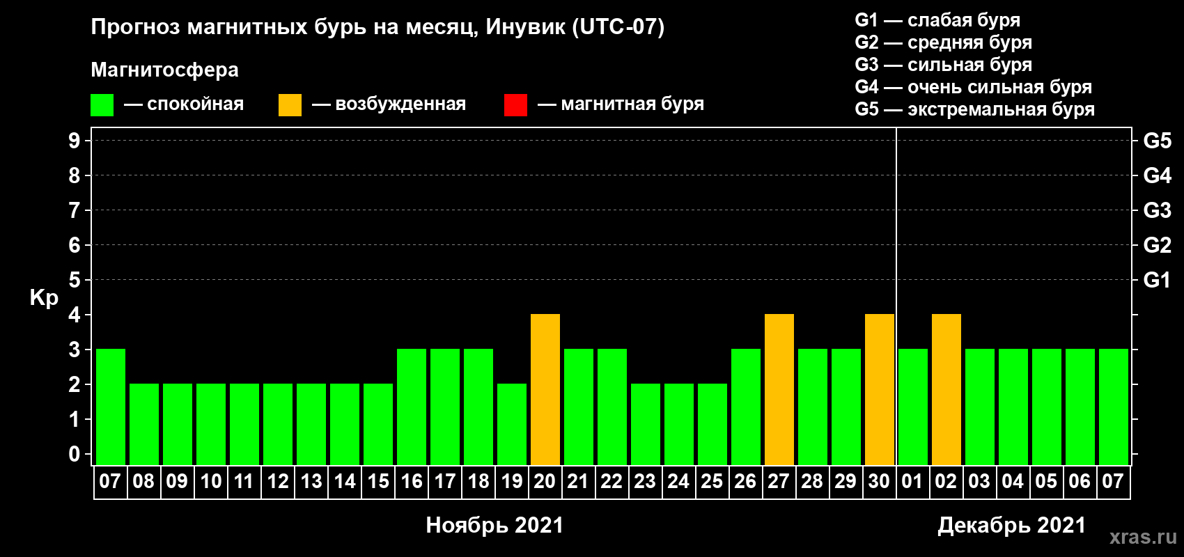 Прогноз магнитных бурь в Инувике — 7 ноября 2021 года
