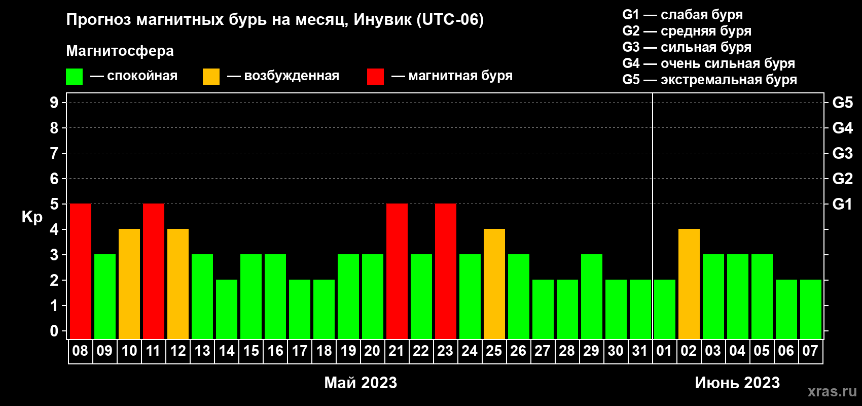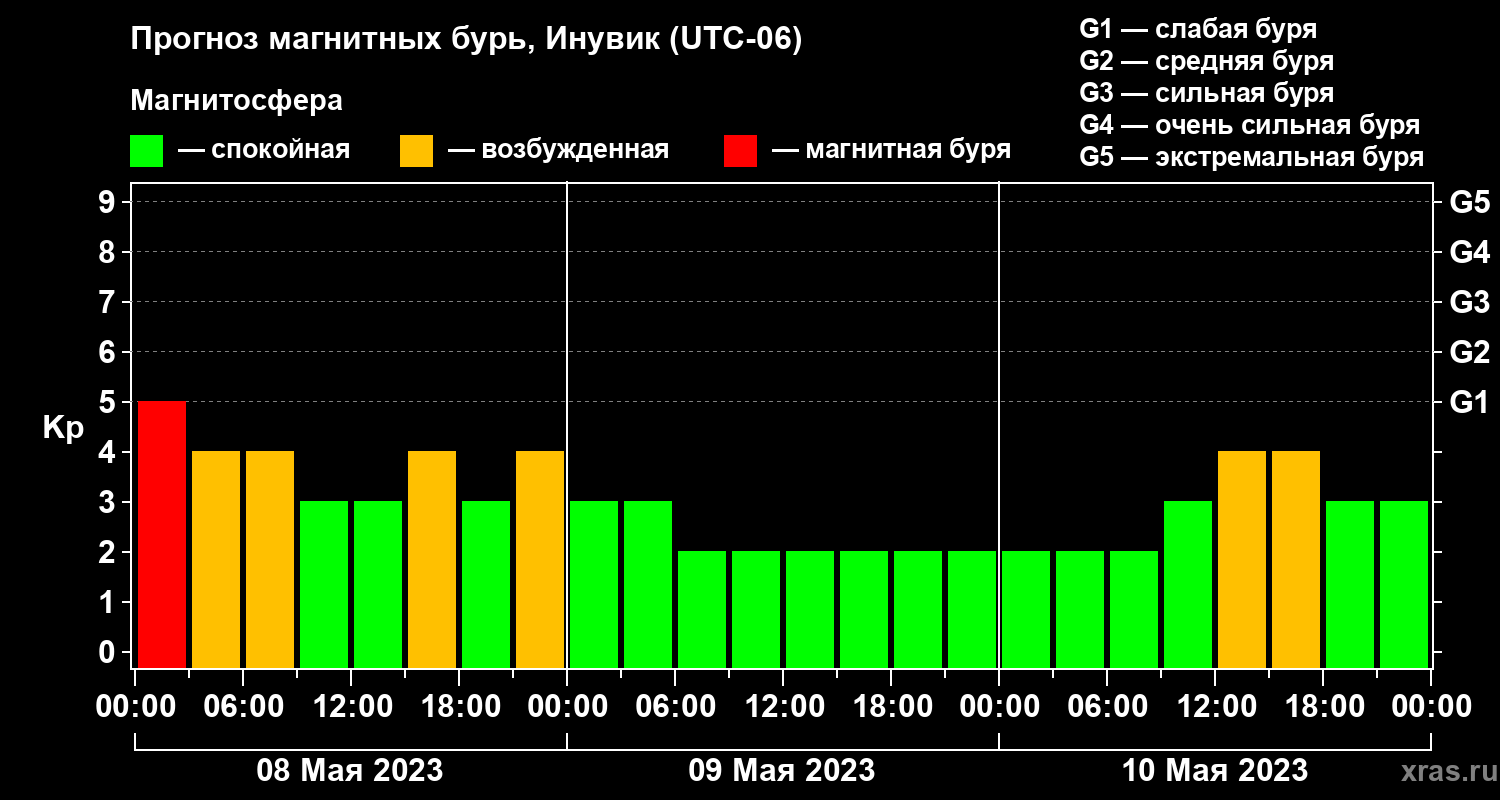 Прогноз магнитных бурь в Инувике — 8 мая 2023 года