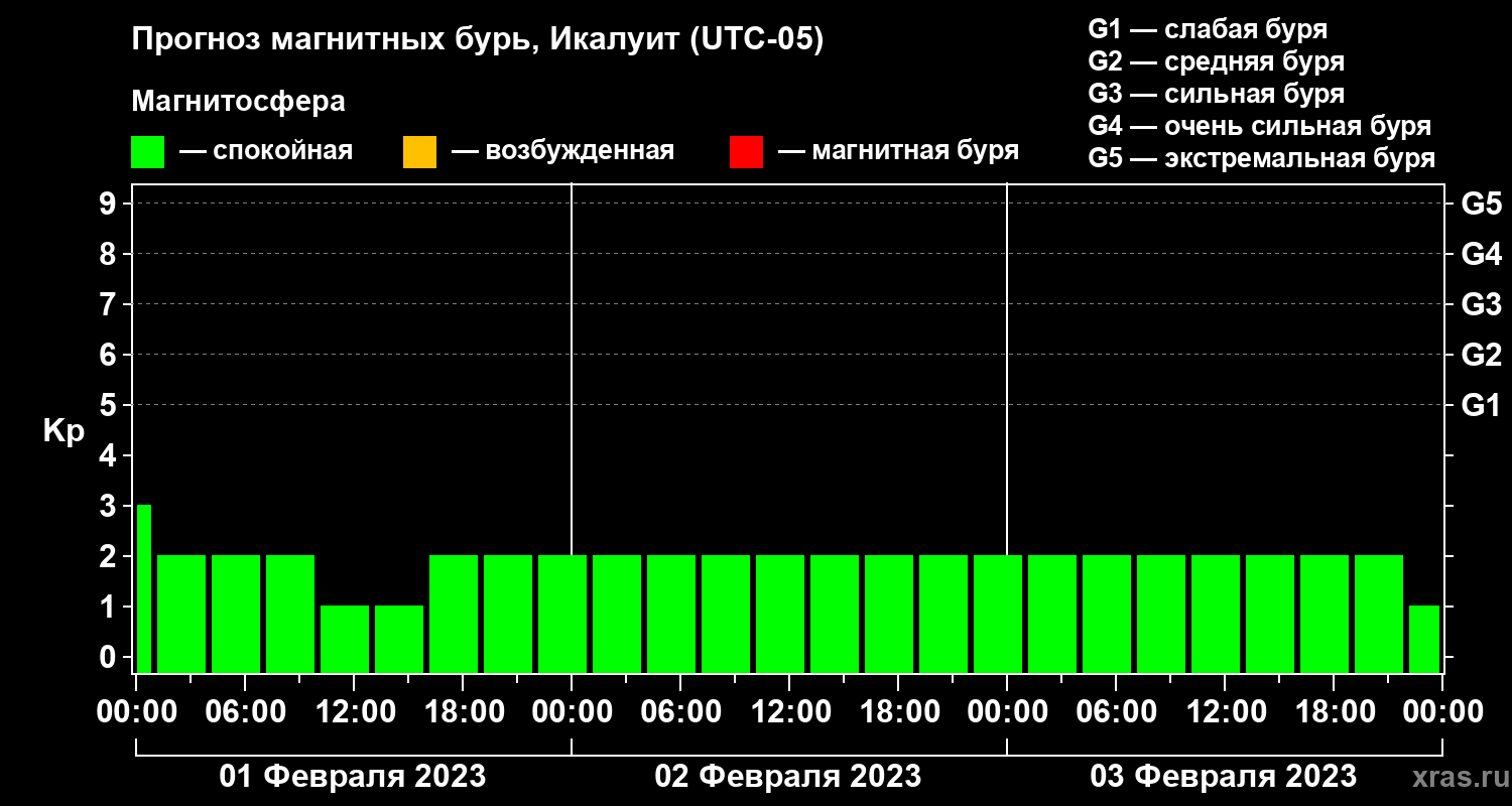 Прогноз магнитных бурь в Икалуите на 1 февраля 2023 года