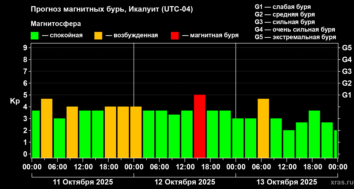 Прогноз магнитных бурь в Икалуите — 11 октября 2025 года