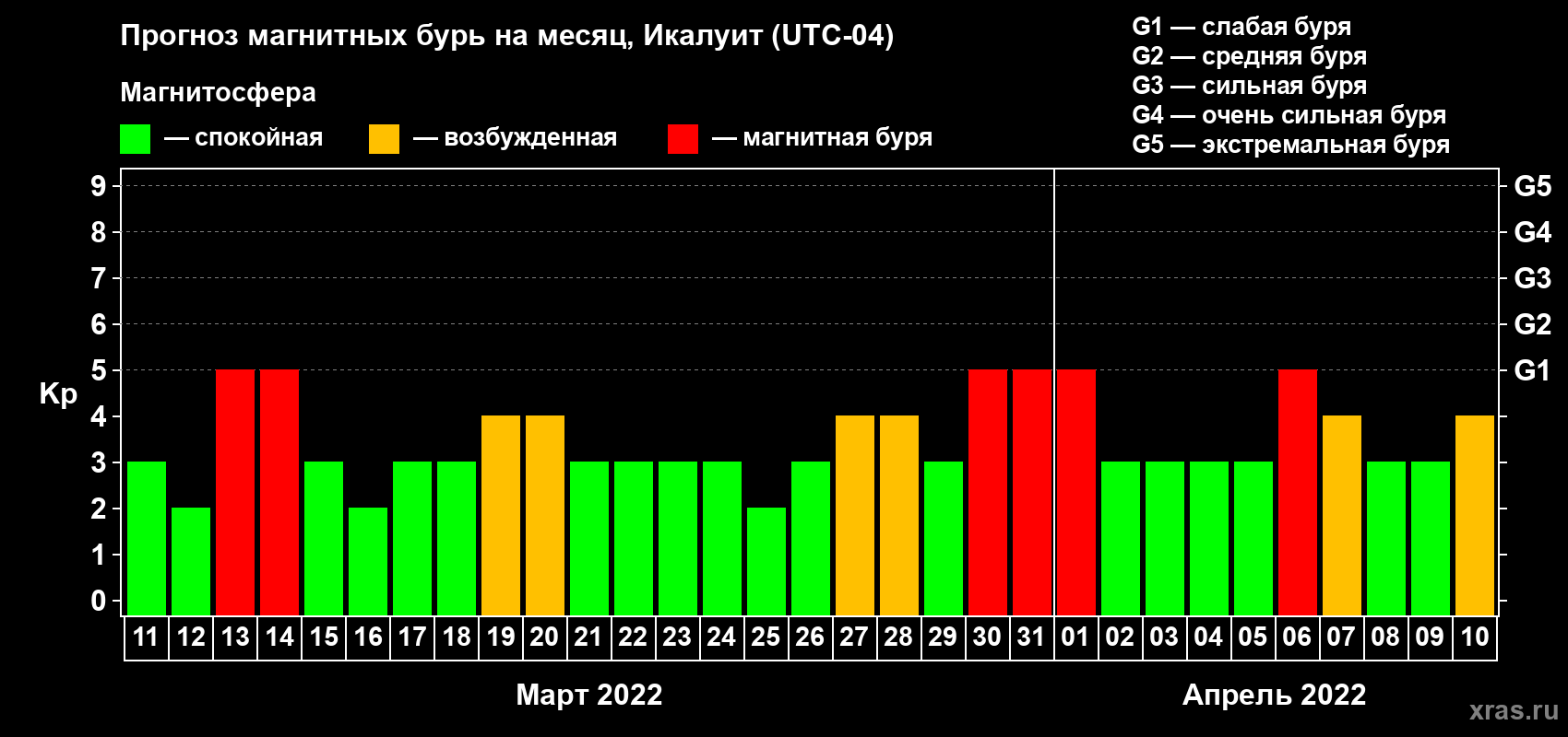 Прогноз магнитных бурь в Икалуите на 11 марта 2022 года