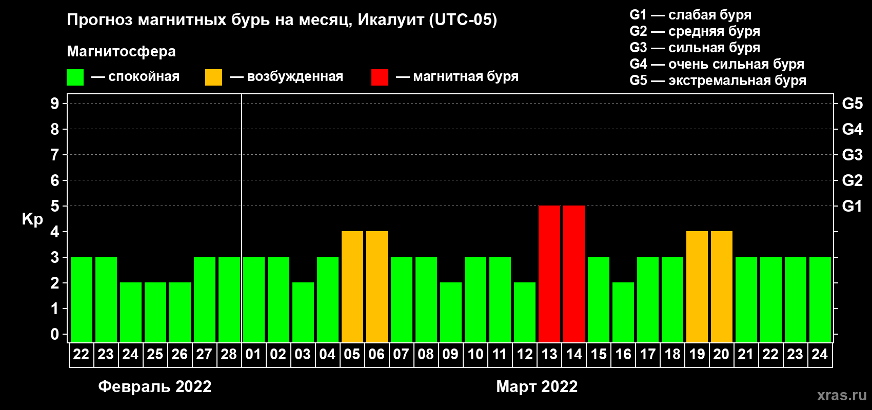 Прогноз магнитных бурь в Икалуите на 22 февраля 2022 года