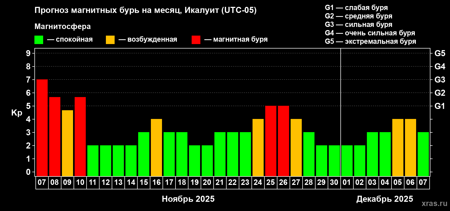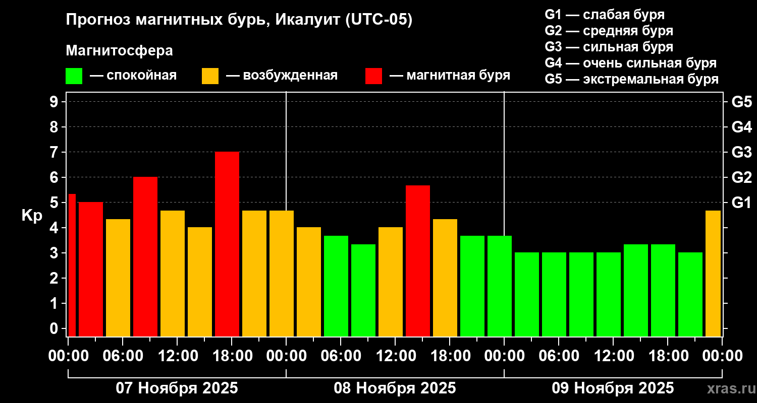 Прогноз магнитных бурь в Икалуите — 7 ноября 2025 года
