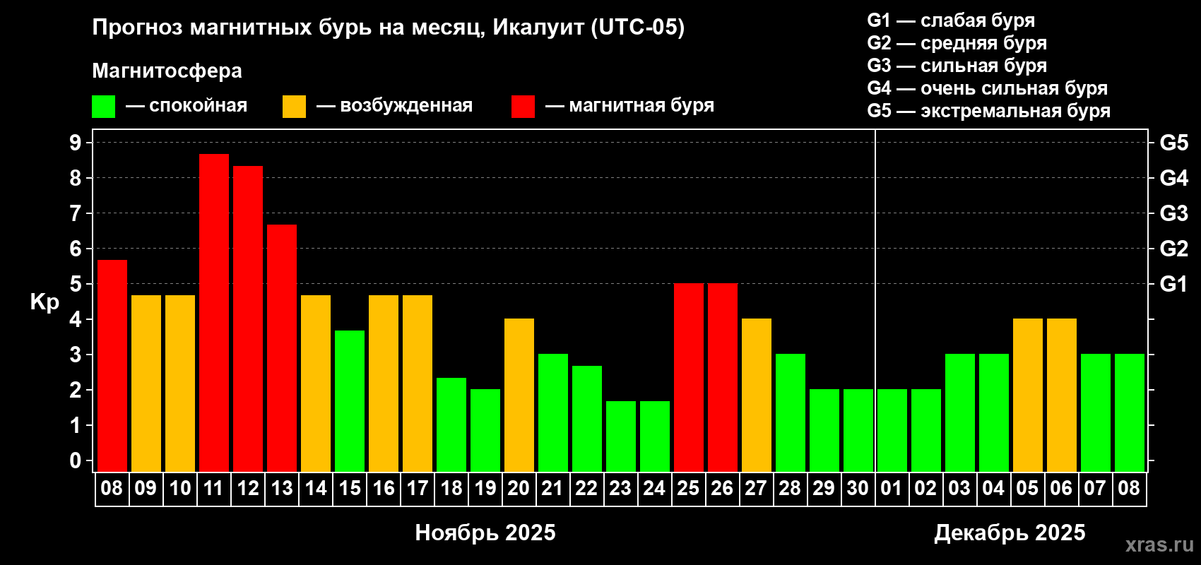 Прогноз магнитных бурь в Икалуите — 8 ноября 2025 года