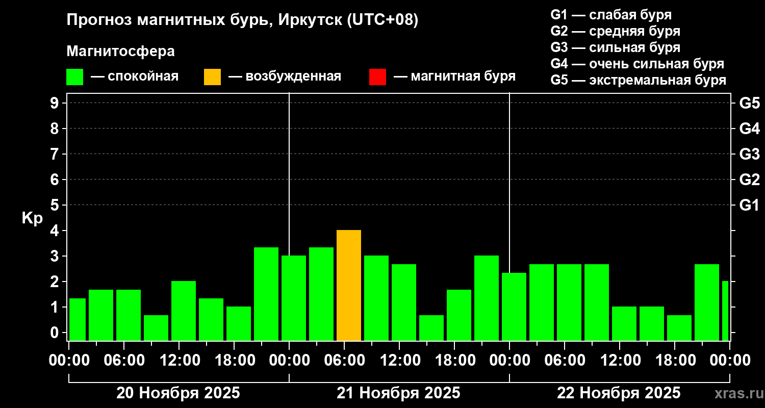 Прогноз магнитных бурь в Иркутске — 20 ноября 2025 года