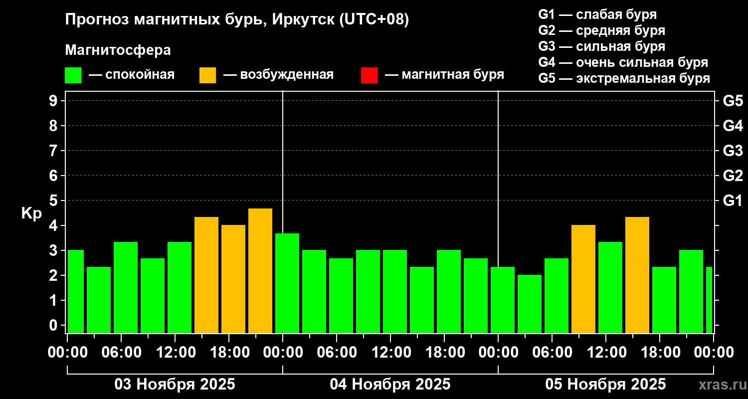 Прогноз магнитных бурь в Иркутске — 3 ноября 2025 года