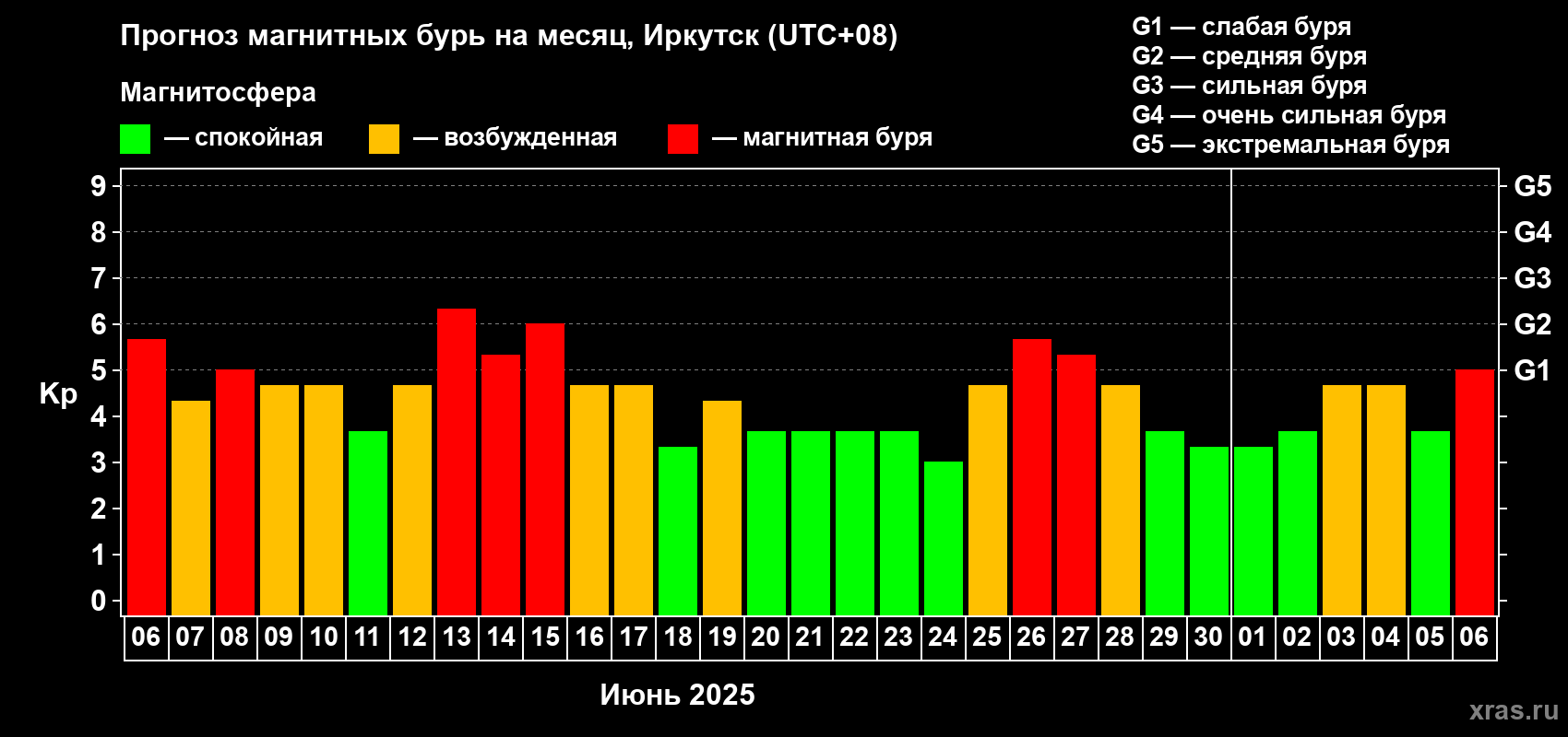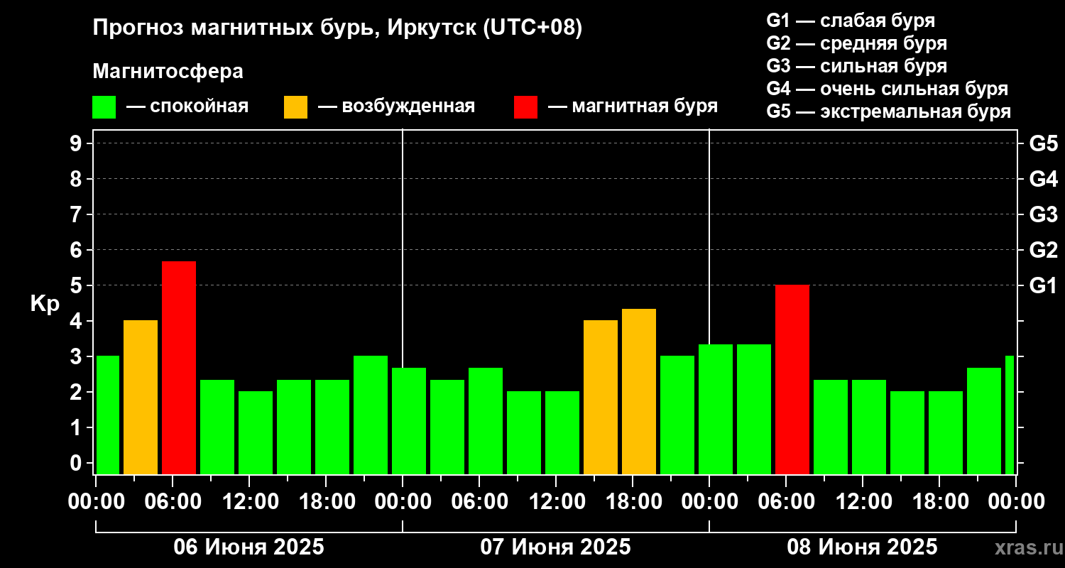 Прогноз магнитных бурь в Иркутске — 6 июня 2025 года
