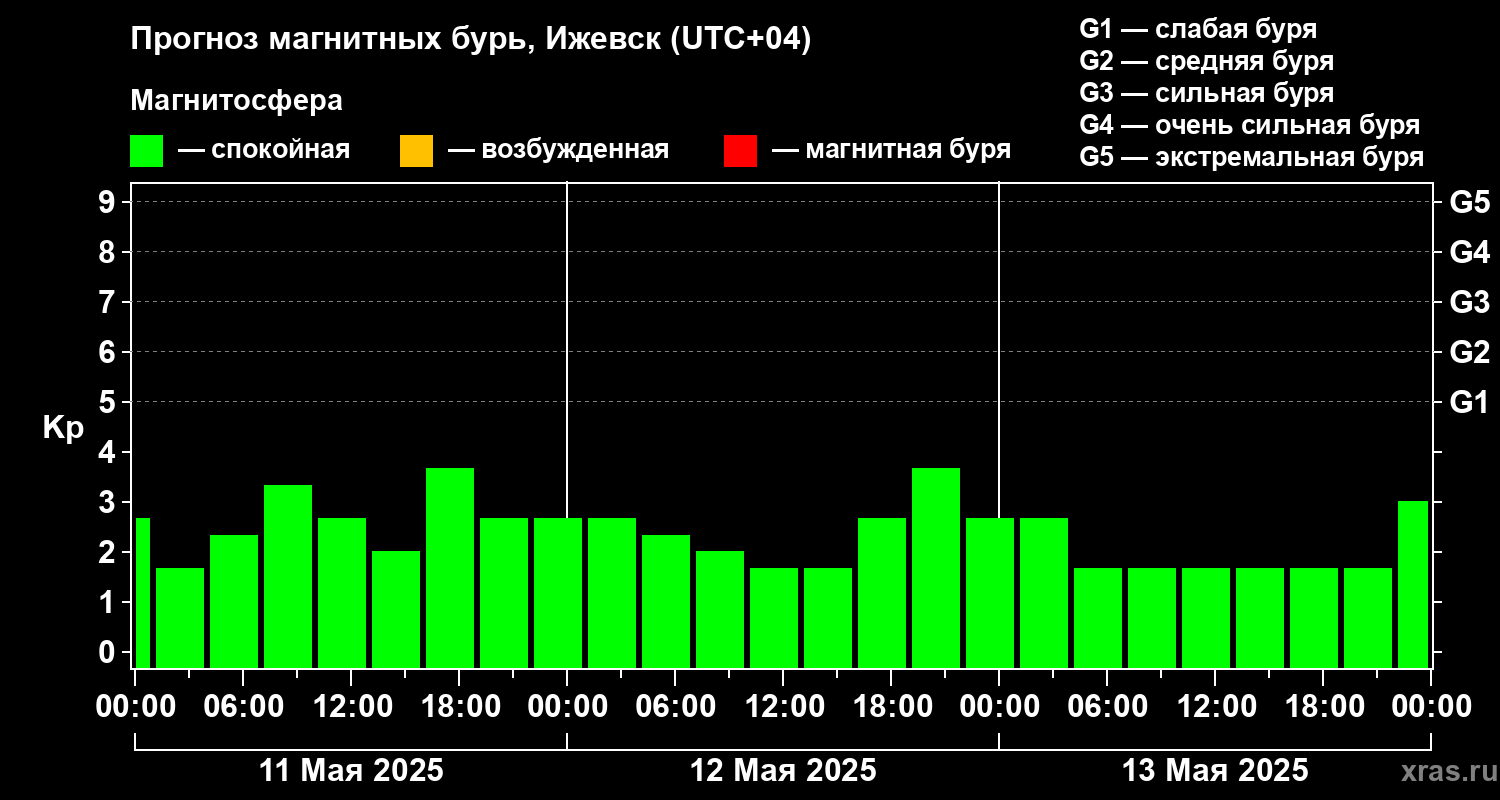 Прогноз магнитных бурь в Ижевске на 11 мая 2025 года