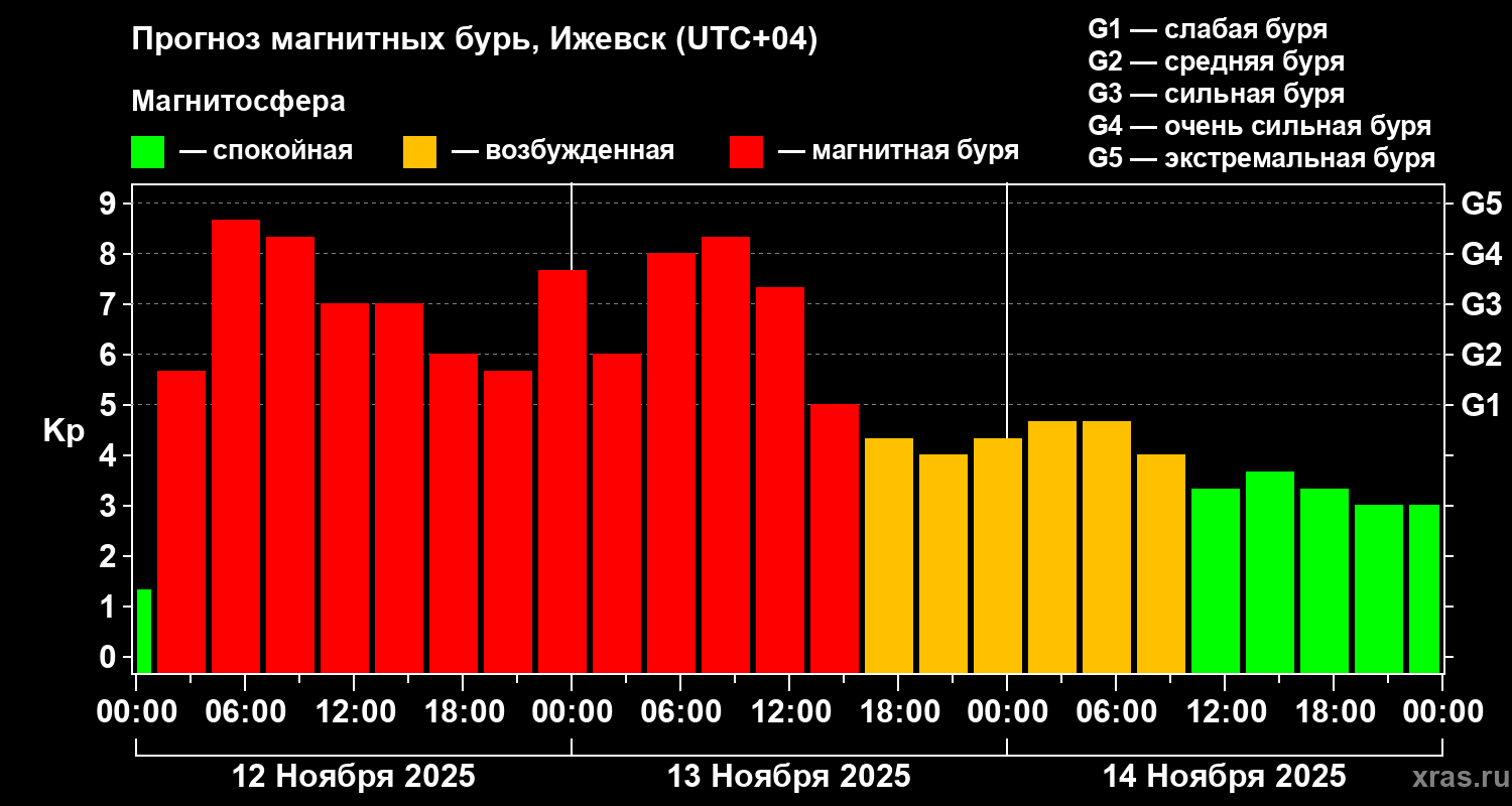 Прогноз магнитных бурь в Ижевске — 12 ноября 2025 года