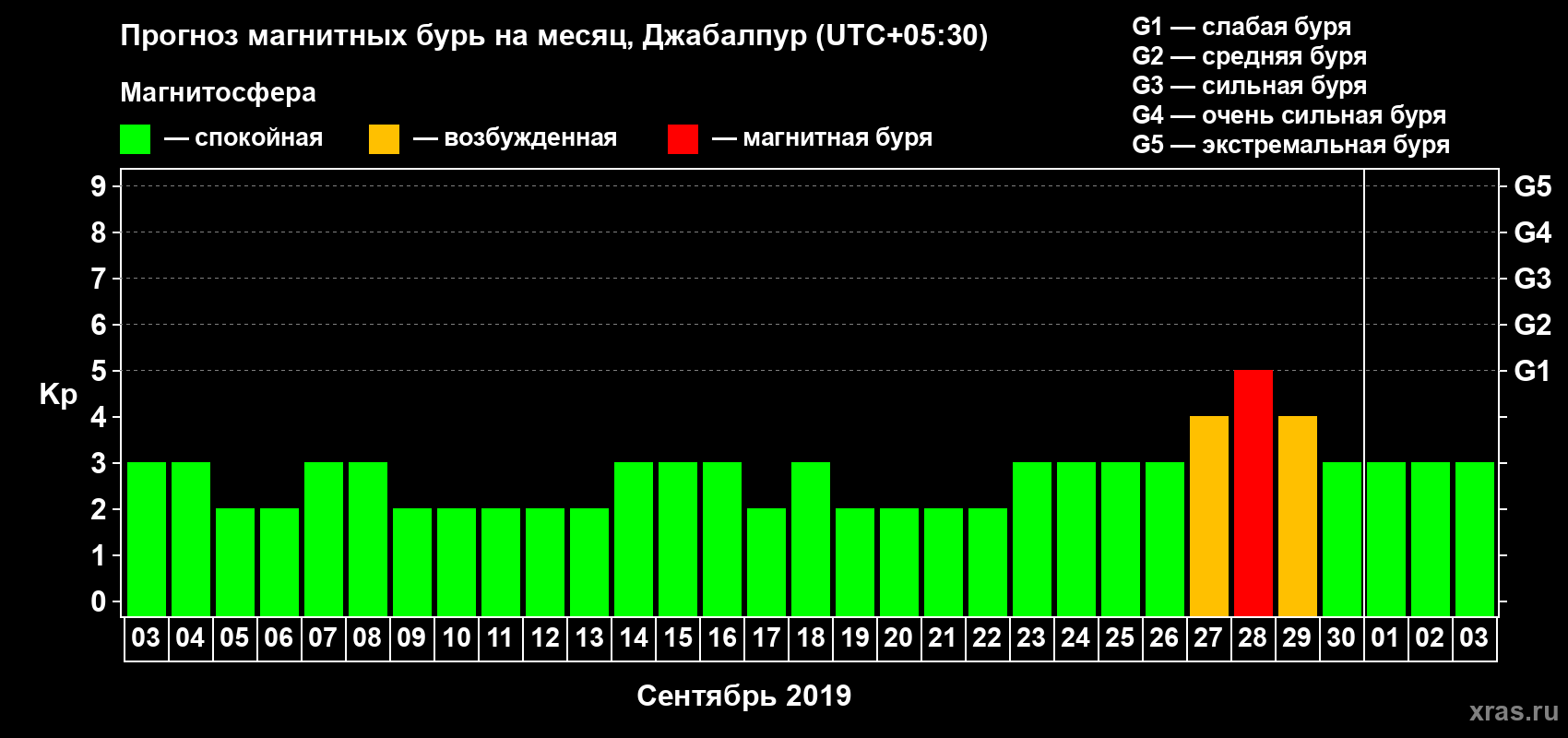 Прогноз магнитных бурь в Джабалпуре — 3 сентября 2019 года