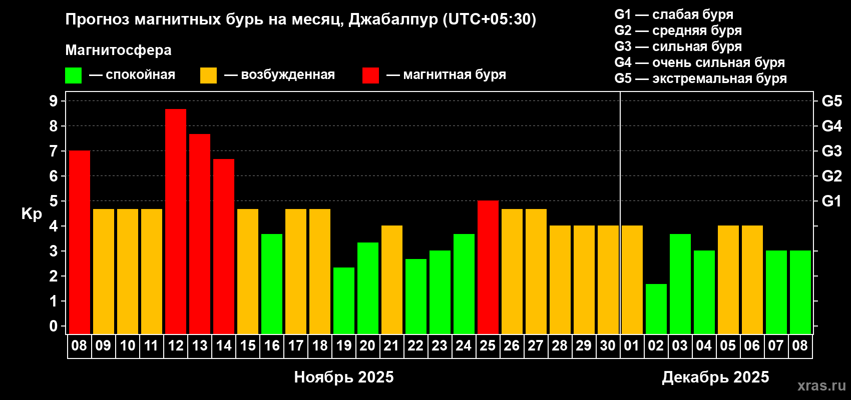Прогноз магнитных бурь в Джабалпуре — 8 ноября 2025 года