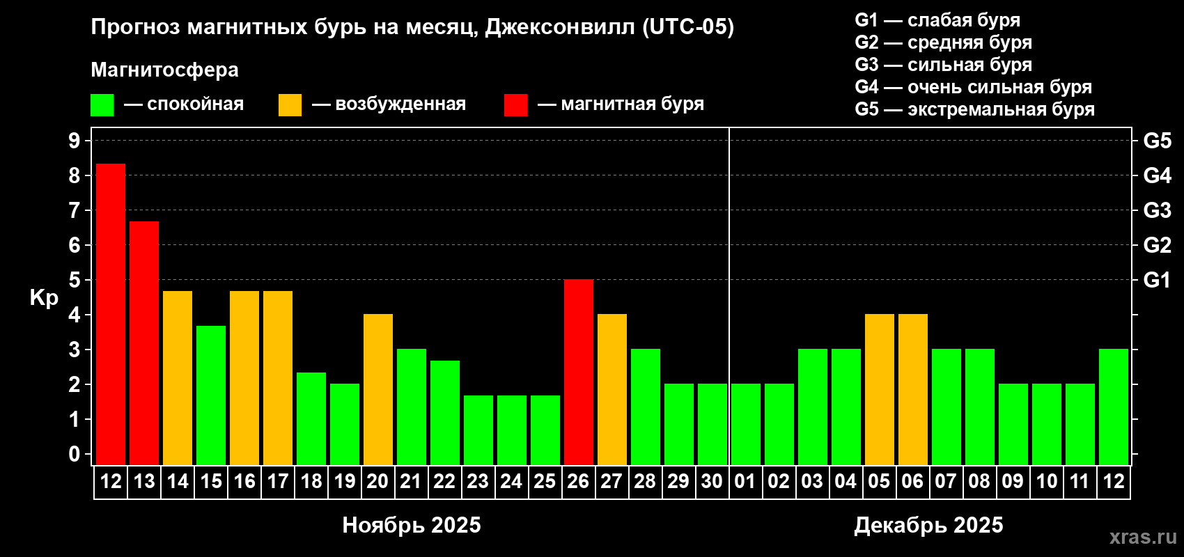 Прогноз магнитных бурь в Джексонвилле на 12 ноября 2025 года