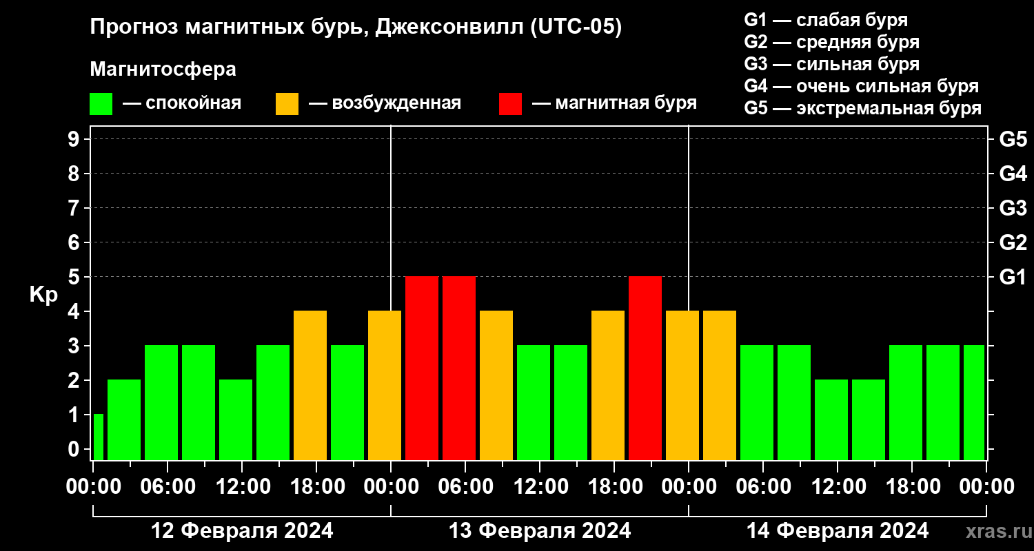Прогноз магнитных бурь в Джексонвилле на 12 февраля 2024 года