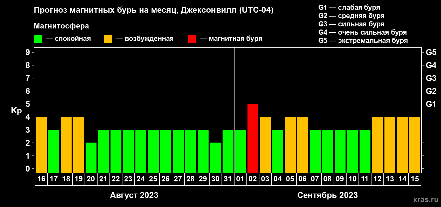 Прогноз магнитных бурь в Джексонвилле на 16 августа 2023 года