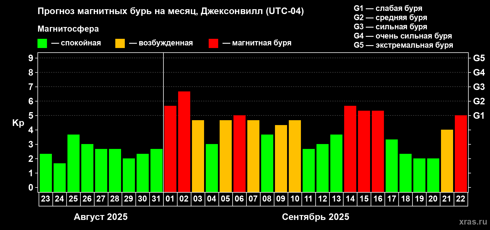 Прогноз магнитных бурь в Джексонвилле на 23 августа 2025 года