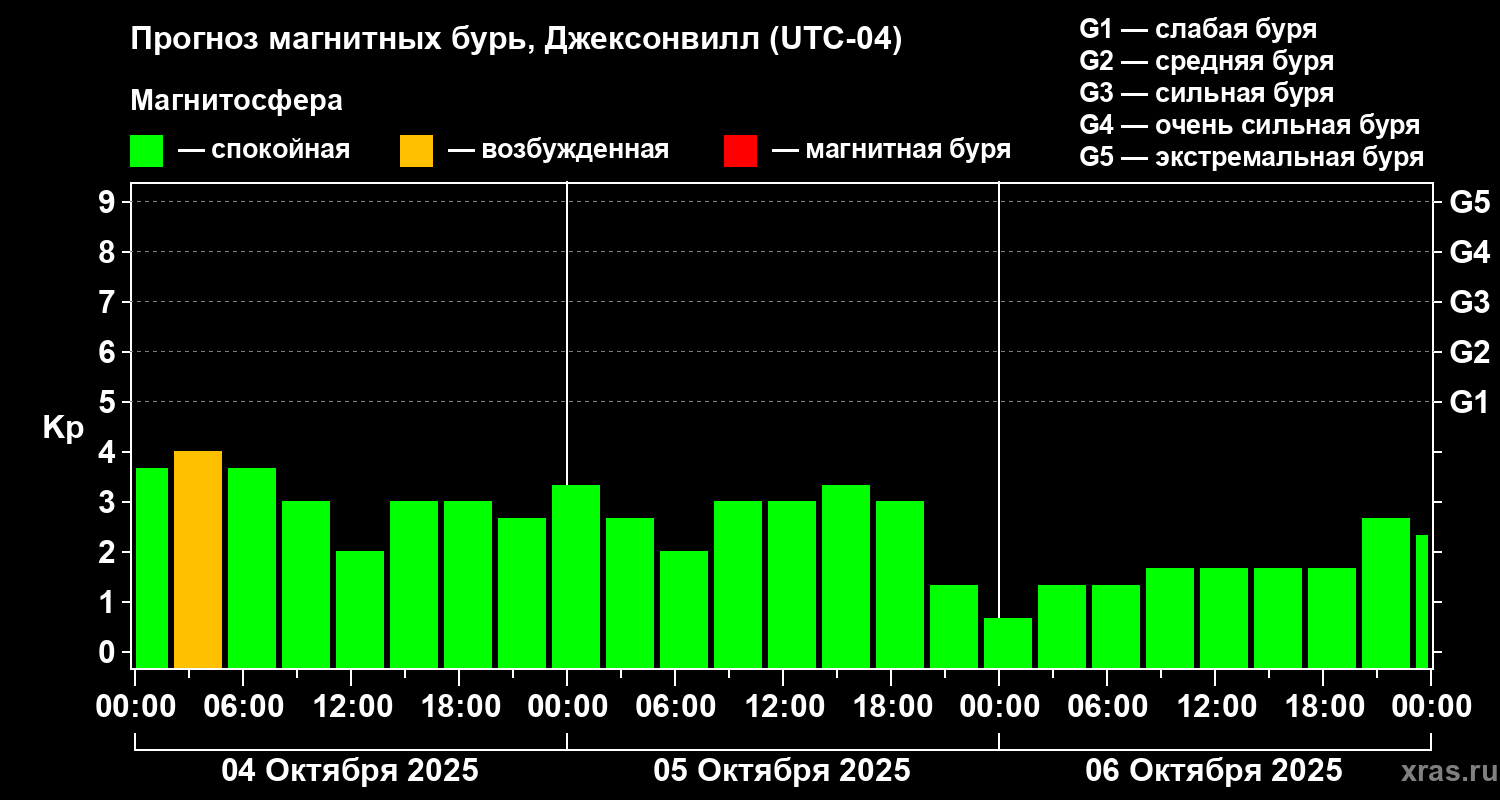 Прогноз магнитных бурь в Джексонвилле — 4 октября 2025 года