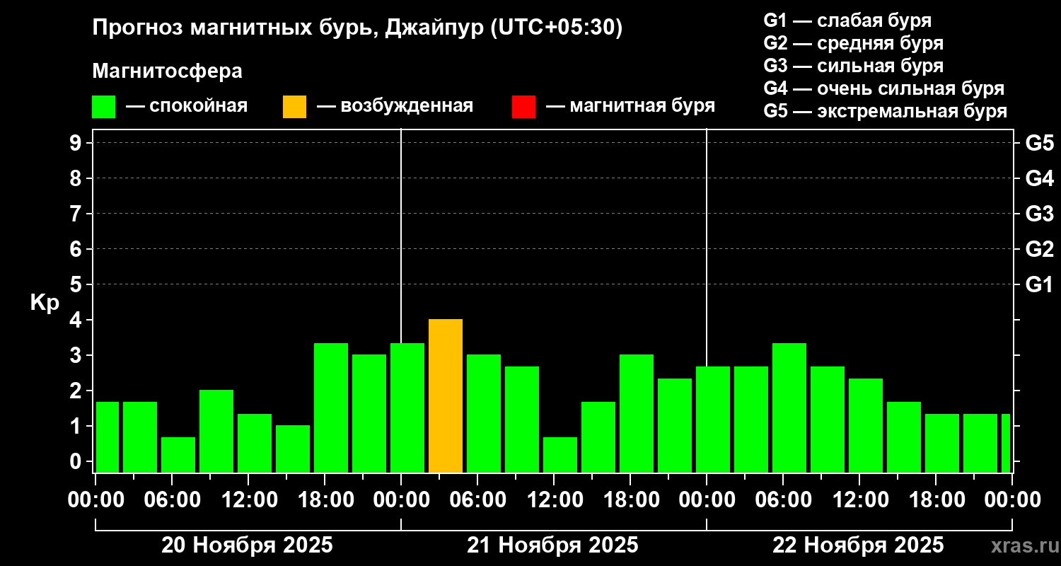 Прогноз магнитных бурь в Джайпуре — 20 ноября 2025 года