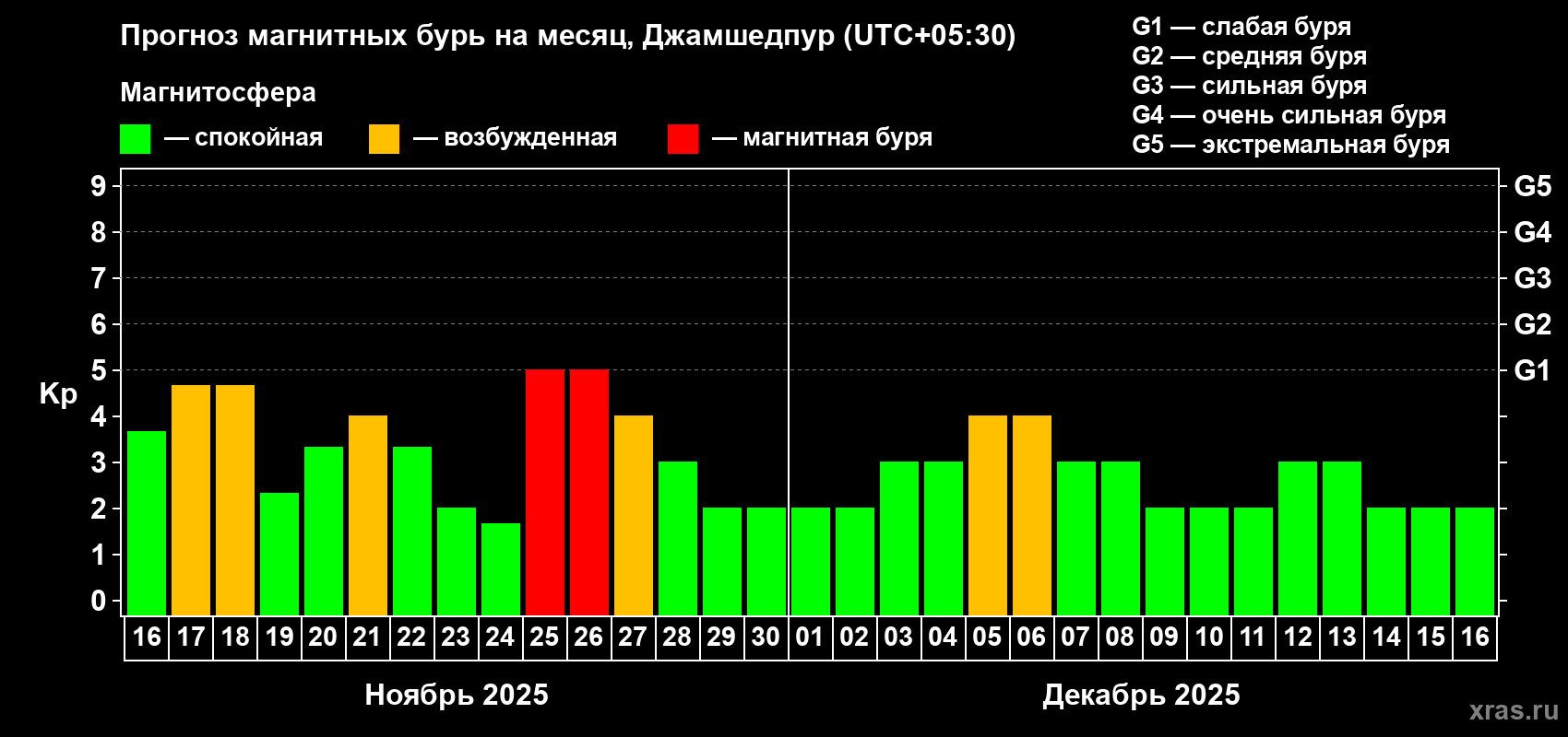 Прогноз магнитных бурь в Джамшедпуре — 16 ноября 2025 года