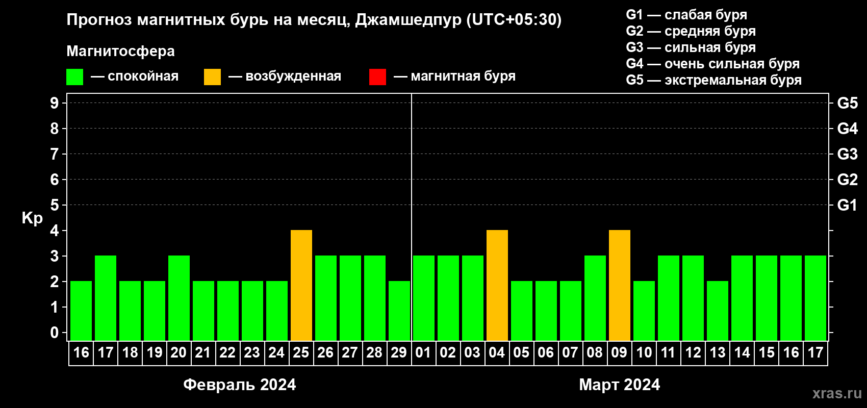 Прогноз магнитных бурь в Джамшедпуре — 16 февраля 2024 года