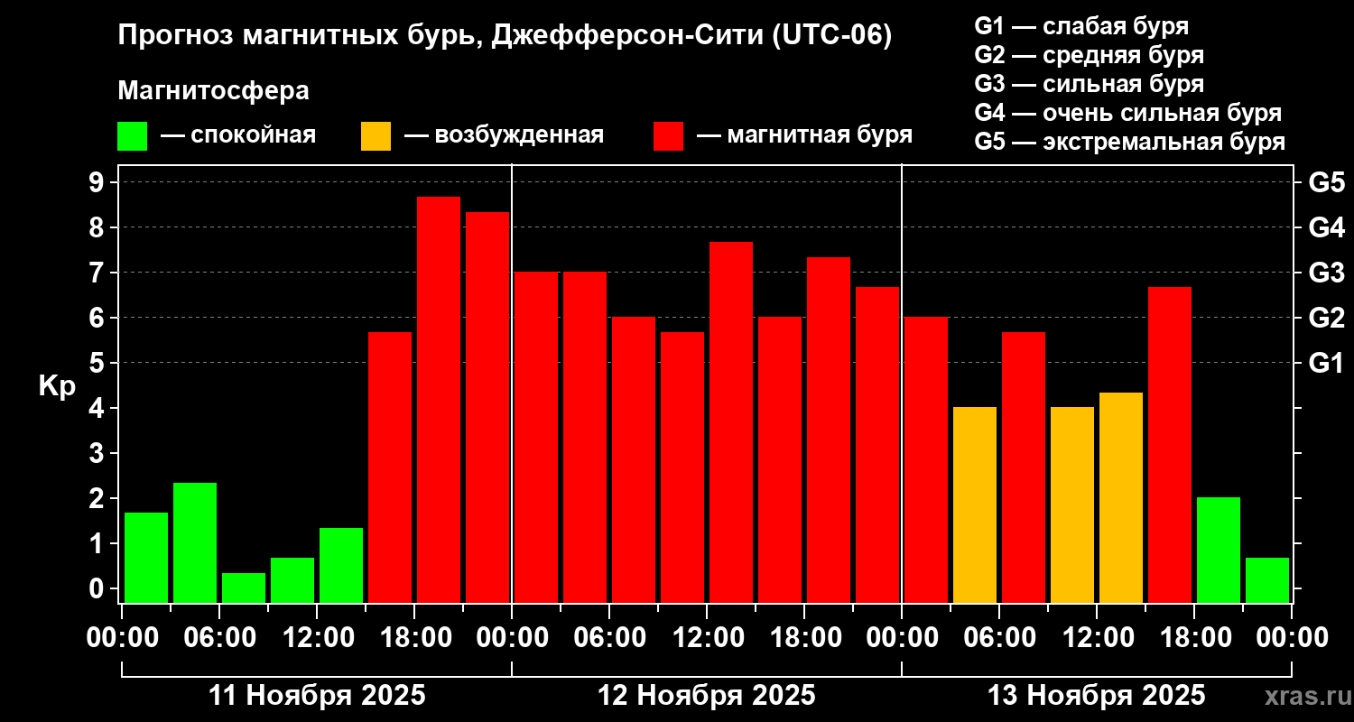 Прогноз магнитных бурь Джефферсон-Сити — 11 ноября 2025 года